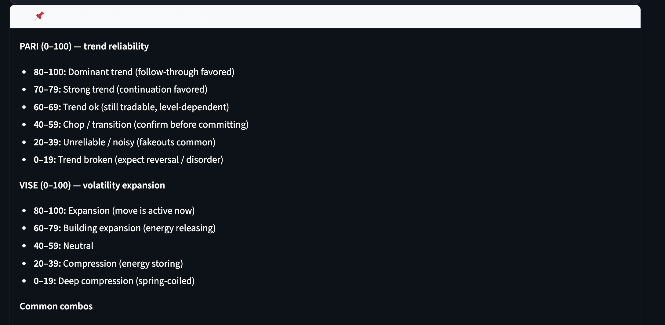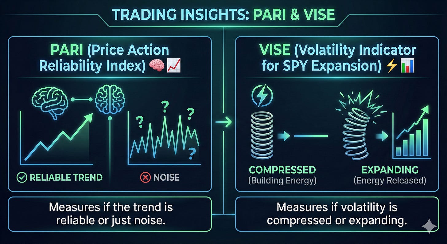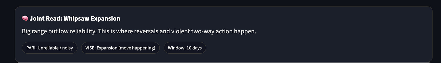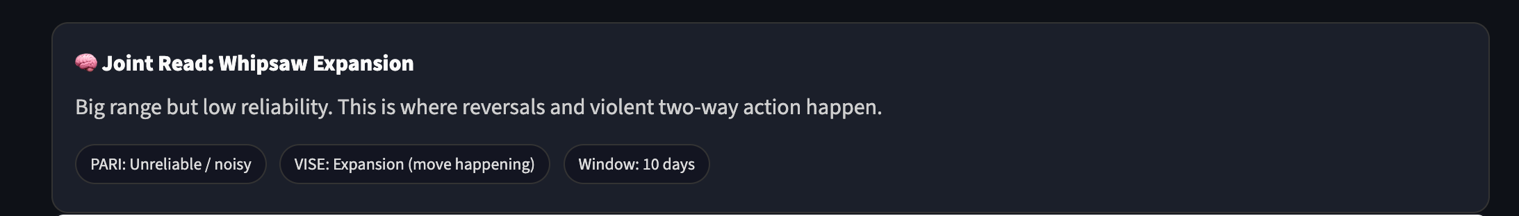 A plain-English interpretation of what PARI and VISE are saying together, so you immediately know whether you’re in a coiled trend, active expansion, whipsaw risk, or chop.