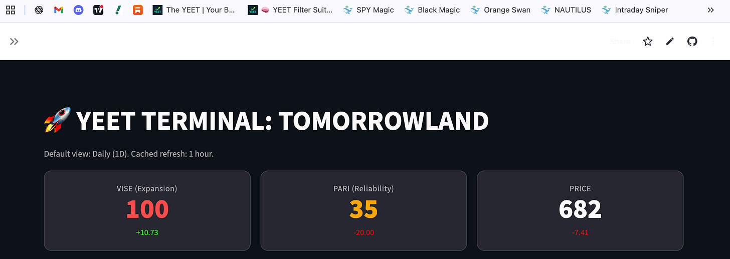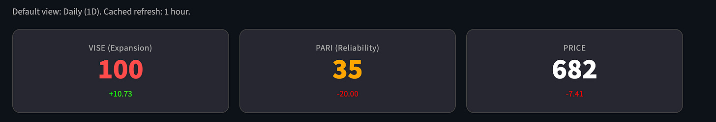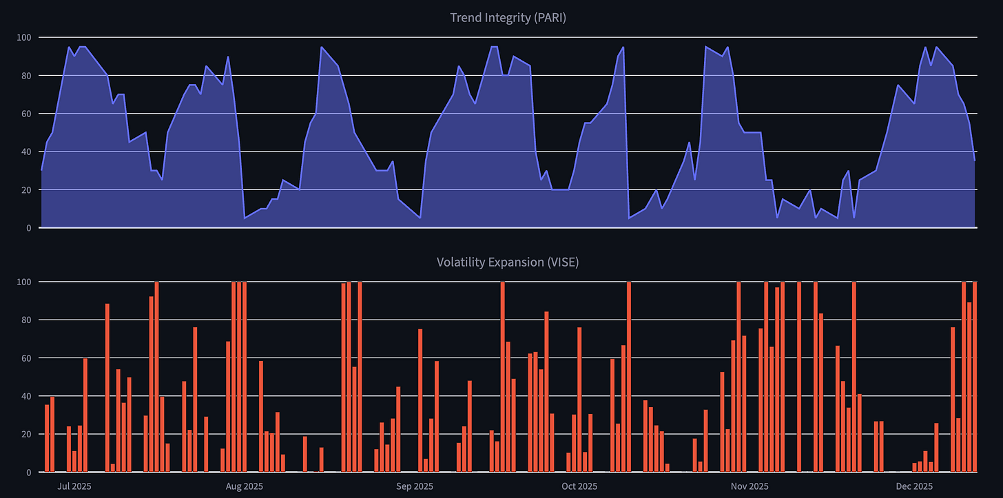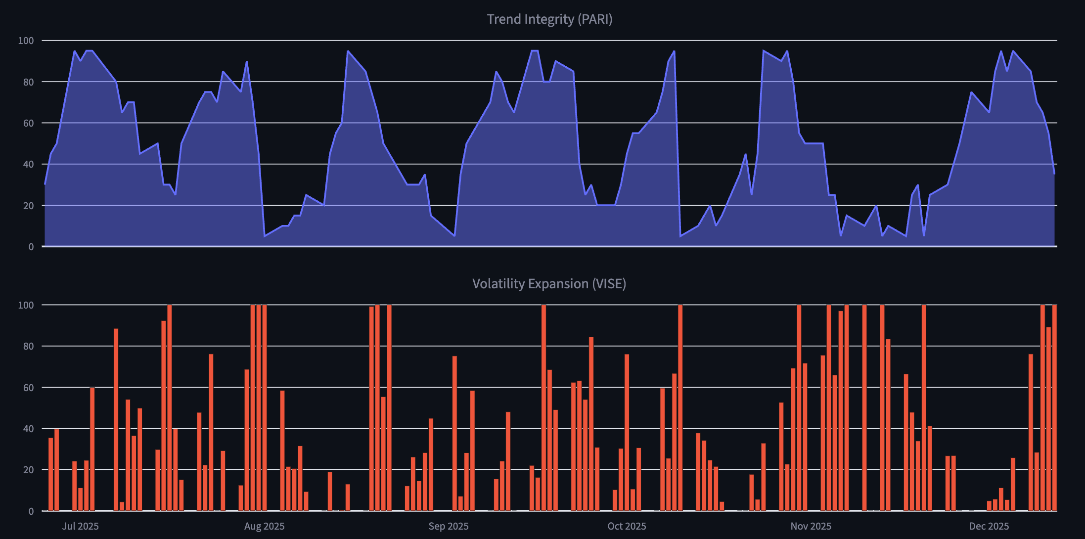 A plain-English interpretation of what PARI and VISE are saying together, so you immediately know whether you’re in a coiled trend, active expansion, whipsaw risk, or chop.