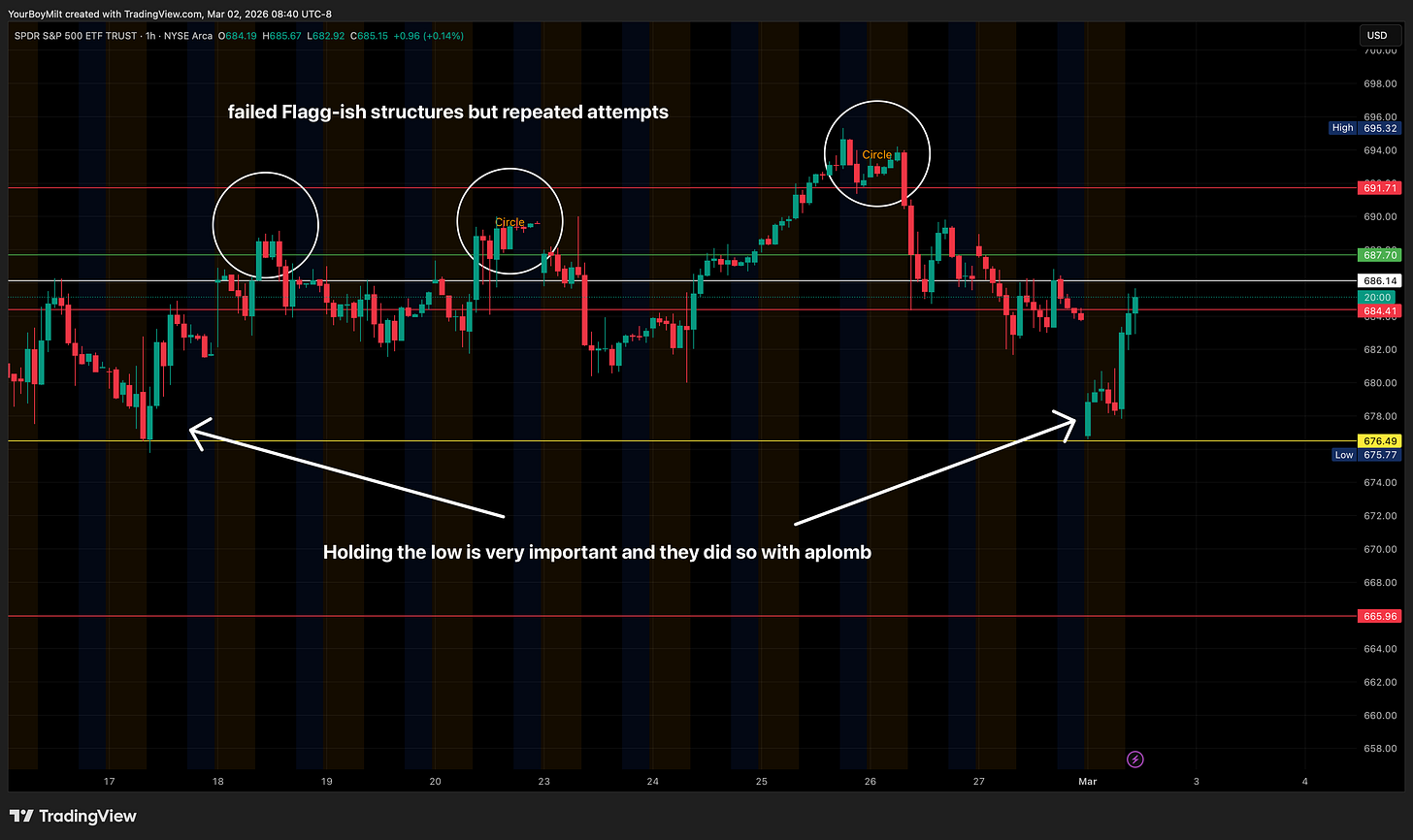 The Current Tape: We are seeing repeated flag attempts. Even though they are failing quickly, they are occurring at successively higher levels. This shows the path of least resistance is still up. The low was held—this a bullish surge that feels bearish because the retests are swift.