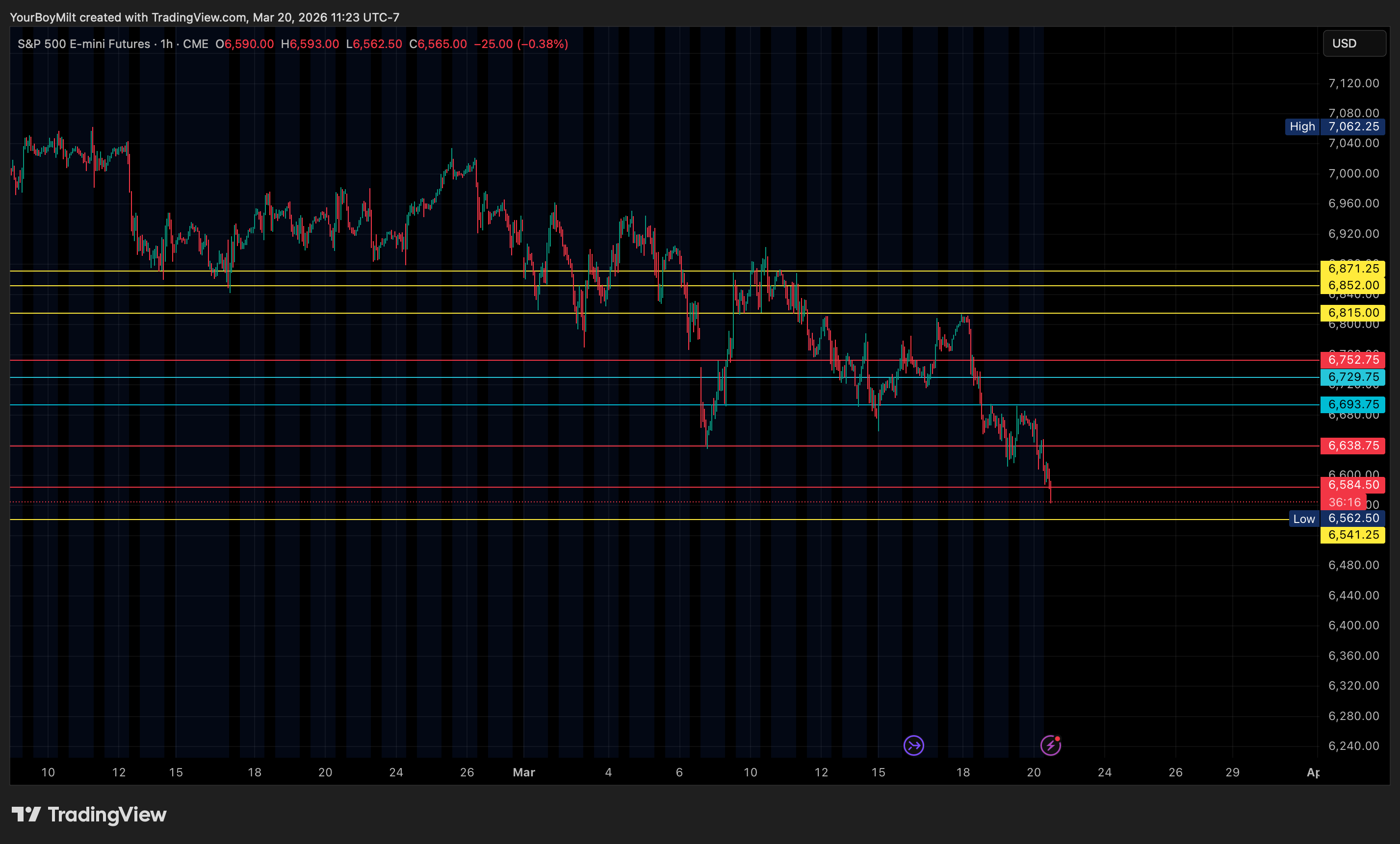 In the last 101 pointed out that bulls wanted to test a high and a rejection would let us know what we needed (third yellow line down). Because they had previously tested lows—and backtested those levels—we knew a rejection of that high meant the test of a new low. We’ve highlighted the next target down, 6531, in YELLOW.