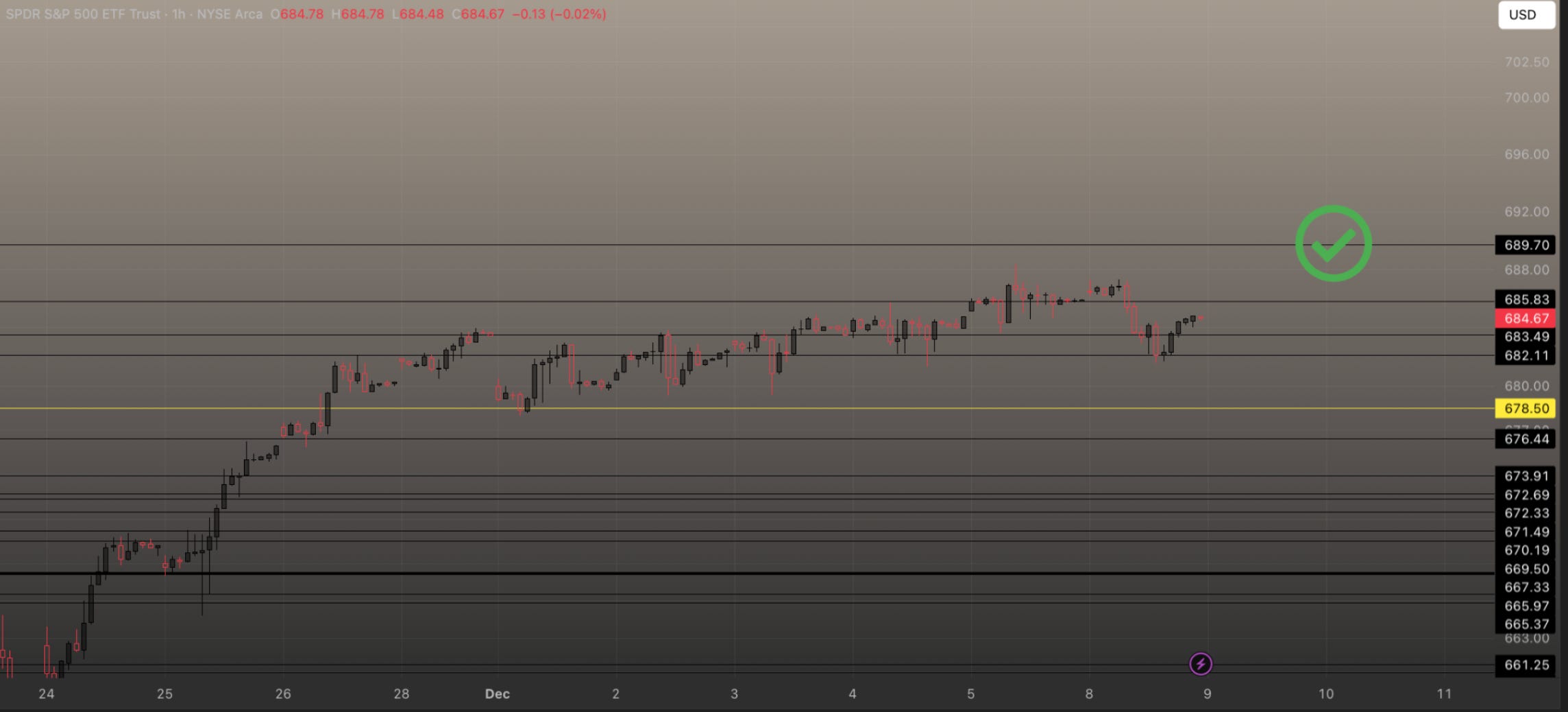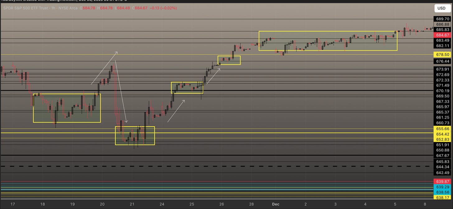Between expansions, price settles into small, tight ranges. These pauses continue to behave like controlled rests instead of danger zones. The recent move into the 682–683 cluster is the perfect example. Price touched the zone, held smoothly and lifted without producing any follow-through selling.