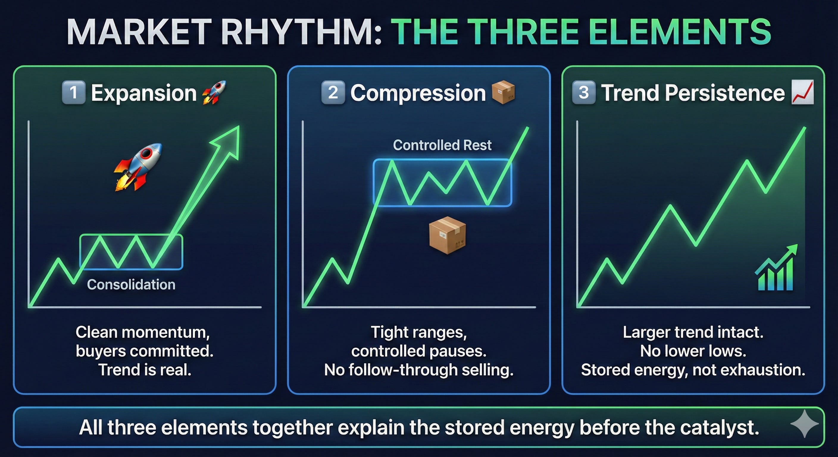 Across all ten backtests, the larger trend never cracked. There were no lower lows, no broken bases and no reversal structures. Even heading into a major macro week, the trend kept its shape. When a move stays this intact before a catalyst, the usual implication is stored energy, not exhaustion.