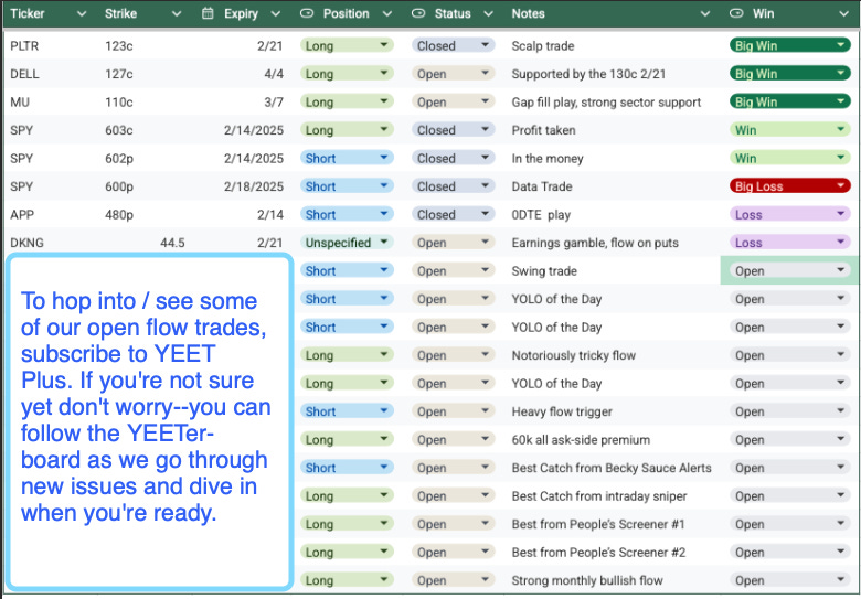 📝 The YEETerBoard: All the YEET and YEET Plus Flow and Callouts in the New Flow Era, tracked. This includes all Milt plays from Discord, YEET twitter, and both the free and paid newsletter callouts.