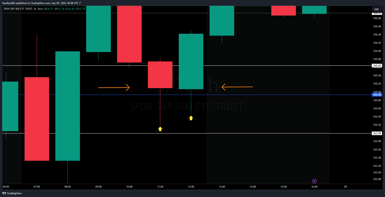 Body Closes: Here we can see that although the wicks dipped down on the hourly (yellow arrows), the bodies CLOSED (orange arrows) above the gap level (blue), and resulted in a rise for SPY
