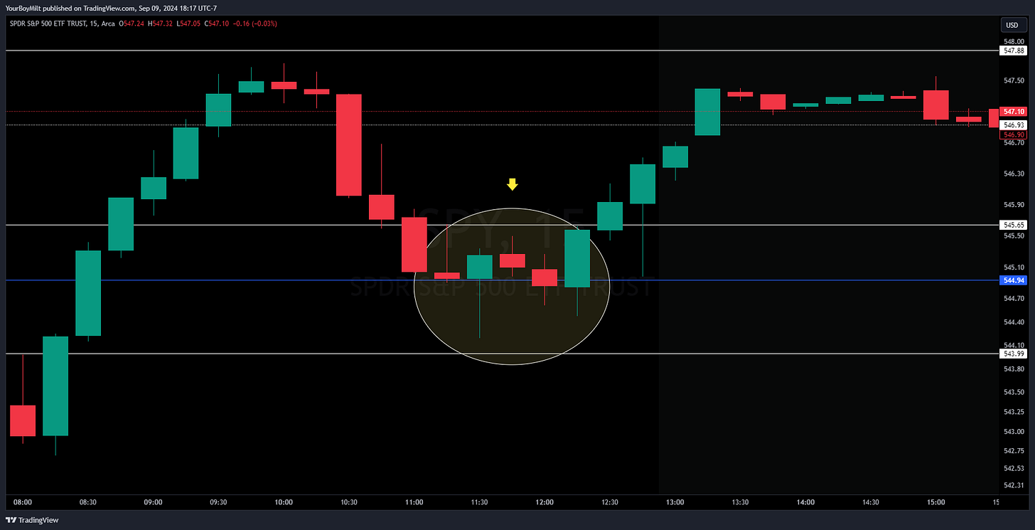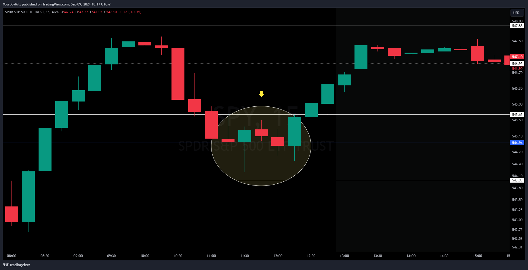 The 15 minute is never definitive on entering, but can give us clues on directionality on trades weâre in. Here, for example, we saw multiple 15 minute holds of the gap level, a sign that SPY was reversing upward.