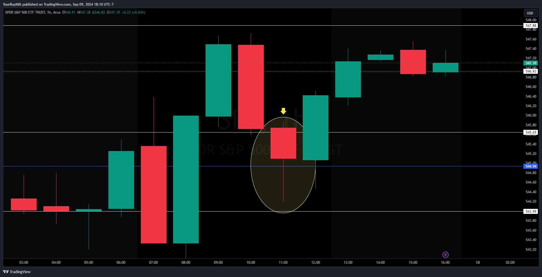 While in todayâs trade, we really only had a couple hours left until the close for moves to happen. Here you can see the 11 am HOURLY candle close above the blue (gap) levelâyou donât need to know what it means yet. You just need to know blue levels are important. When youâre that close to the end of the day, how can you get some more info aside from the hourly close?