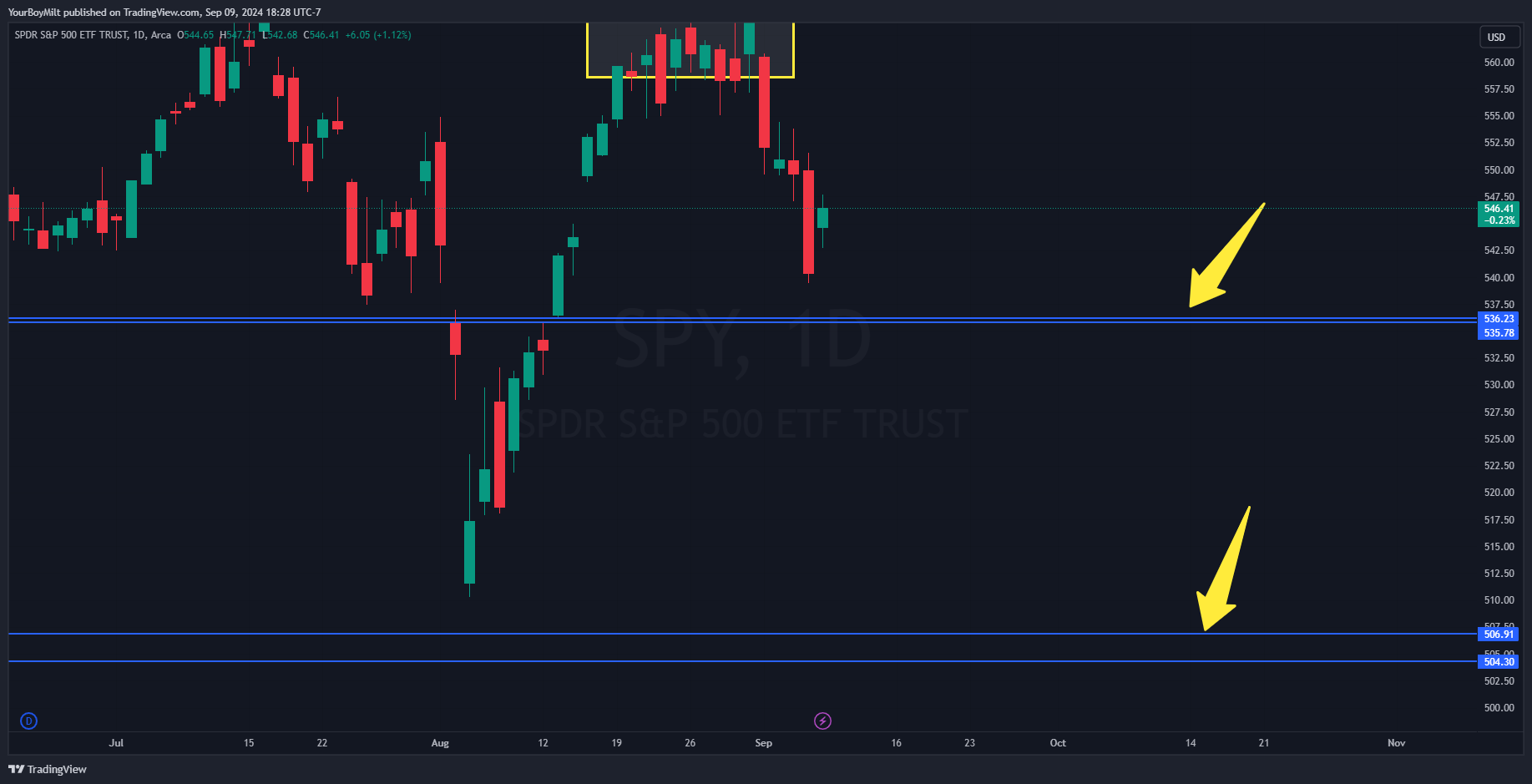 In last nightâs YEET Plus SPY analysis, we had an example of how the daily can be used to find gaps, as well as in our flow play. Here, you can see SPY has two gaps on the daily to the downsideâone small and one largeâwhich can inform our decision making going forward. If we have a CPI fall, for example, that first gap set is a target. Longer term, the second gap set is: