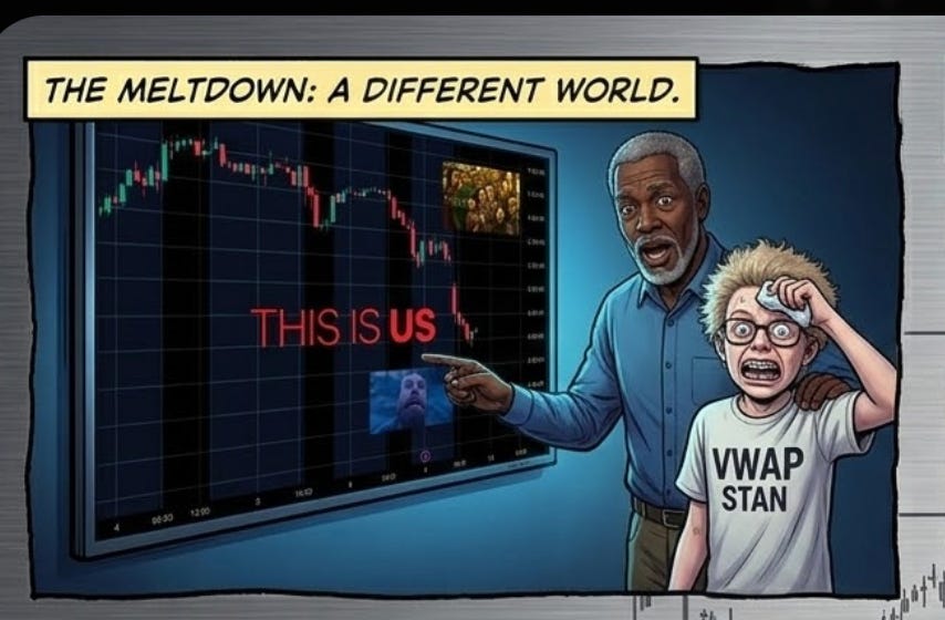 Lil VIX the VWAP Stan: “Milt, look at the tape! We just nuked 2% in the overnight session before the clock even struck midnight! 🕛 How are we supposed to find the floor without a hundred bands?”