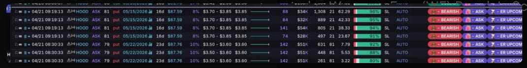 On April 21st, whales started stacking HOOD puts in the exact formation the filter is built to flag. Four sweeps on the 81 put, same expiry, all hitting within the same minute at 09:19. Then two more on the 79 strike from earlier that morning. All tagged bearish. Confidence scores ranging from 88% to 96%. Premiums ranging from $28K to $54K per sweep.