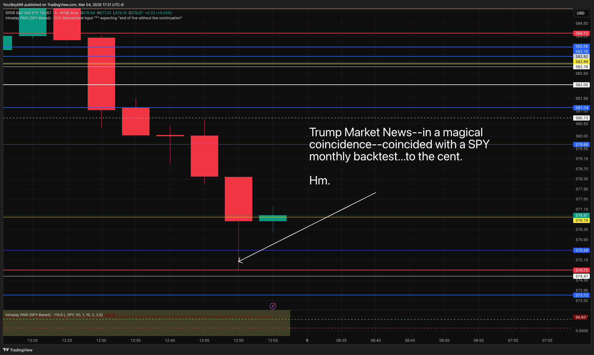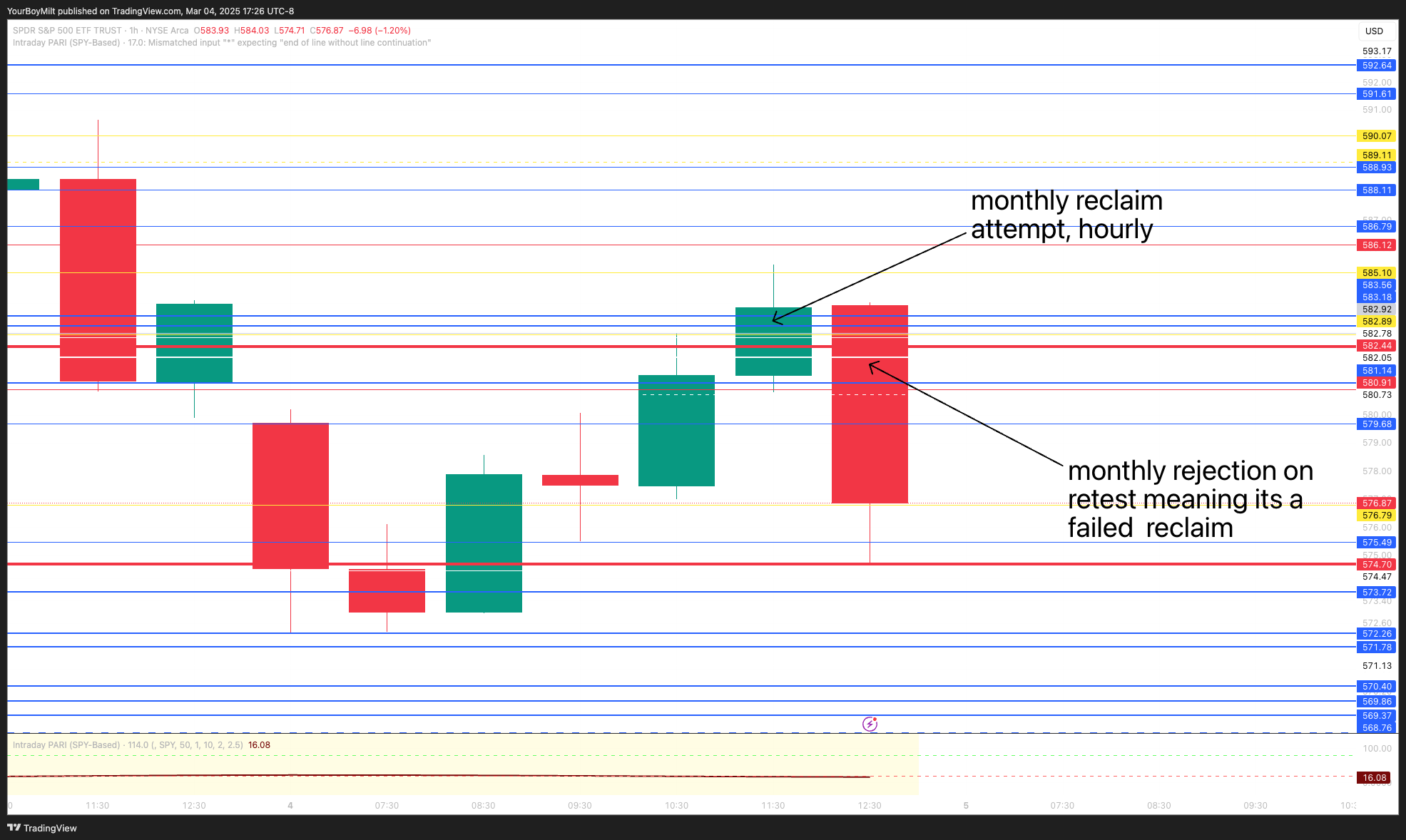 SPY climbed back toward a monthly level, a relic of liquidity long left behind. This was a place where decisions had been made before, where the market had once either vaulted higher or been cast back down. Focus here on the monthly level, 582.44