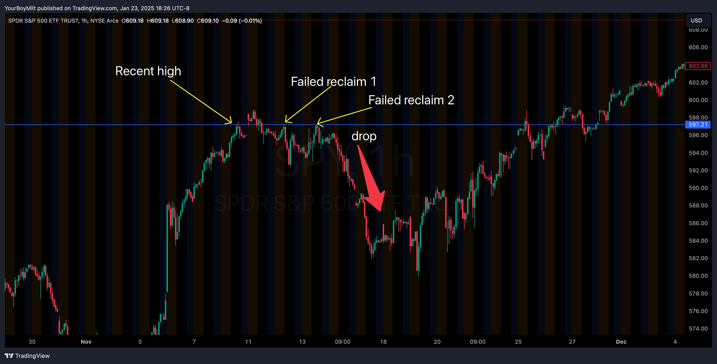 Multiple failed reclaims at local highs on the hourly. Here’s how that looked using out July/August example: