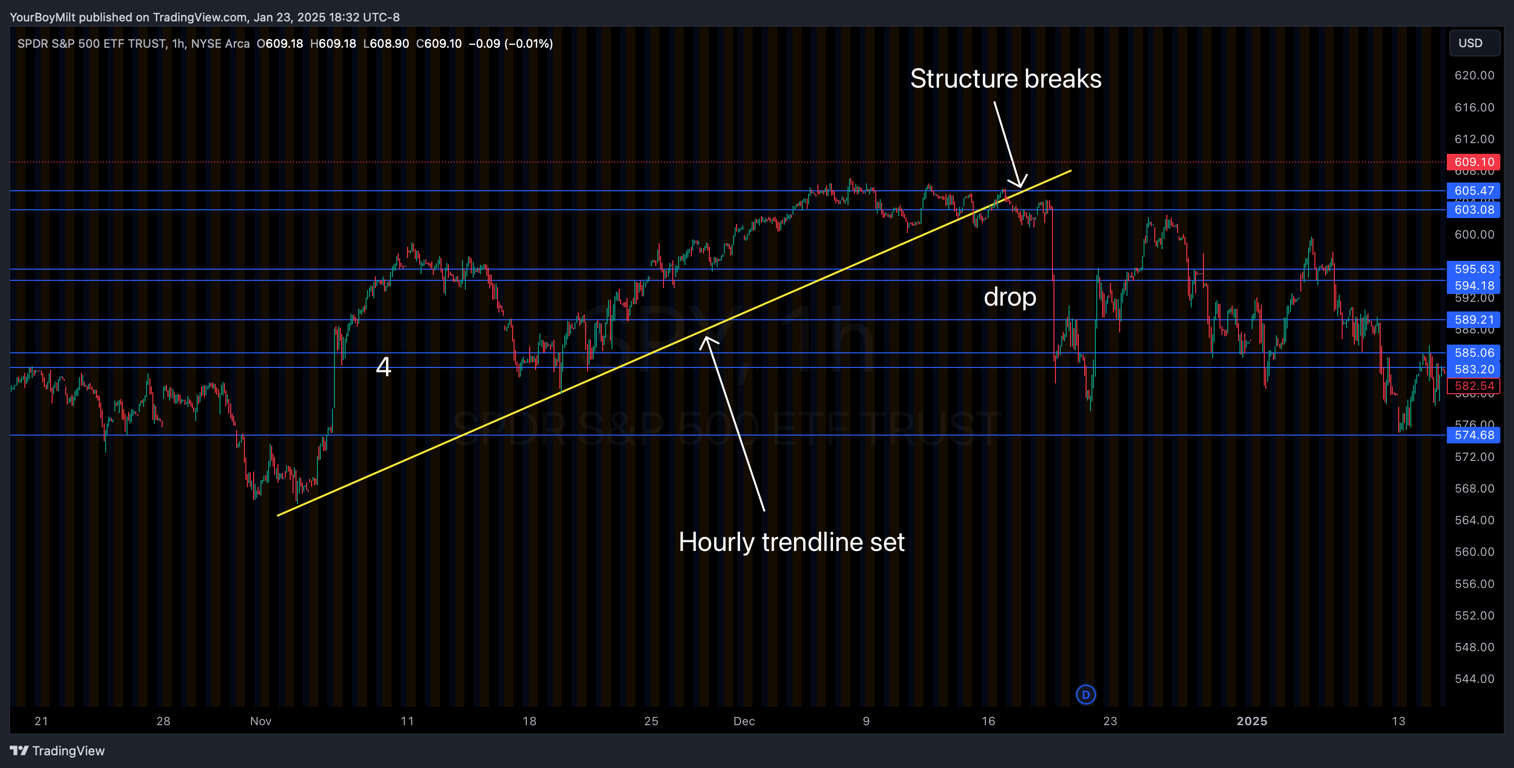 A break in structure: a long established channel or trendline on the hourly timeframe