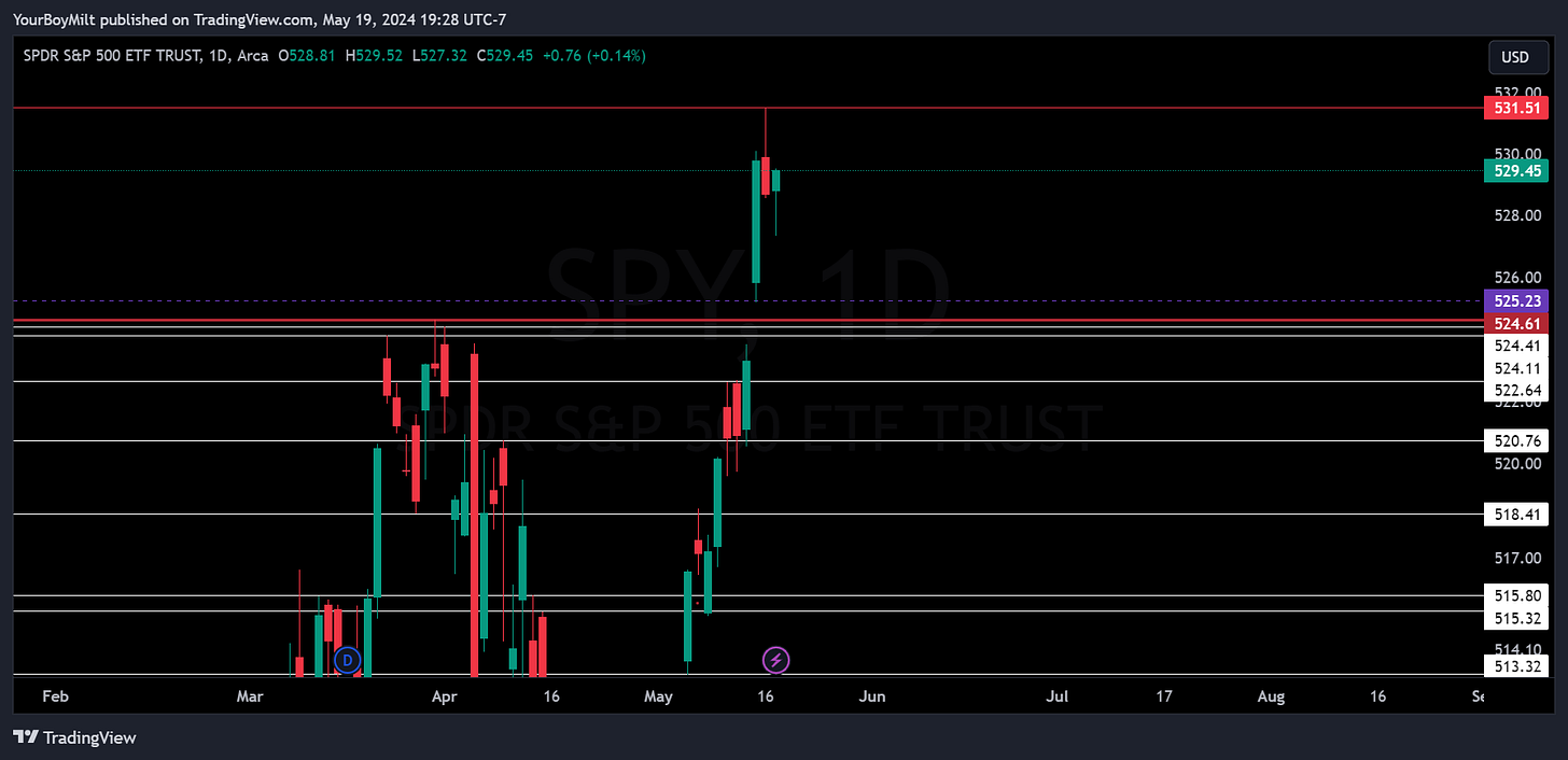 Similarly, we’re currently at all time highs with no weekly levels—let alone monthly levels—as a true guide. Here is the current SPY Price Action with levels solely set to weekly and monthly: