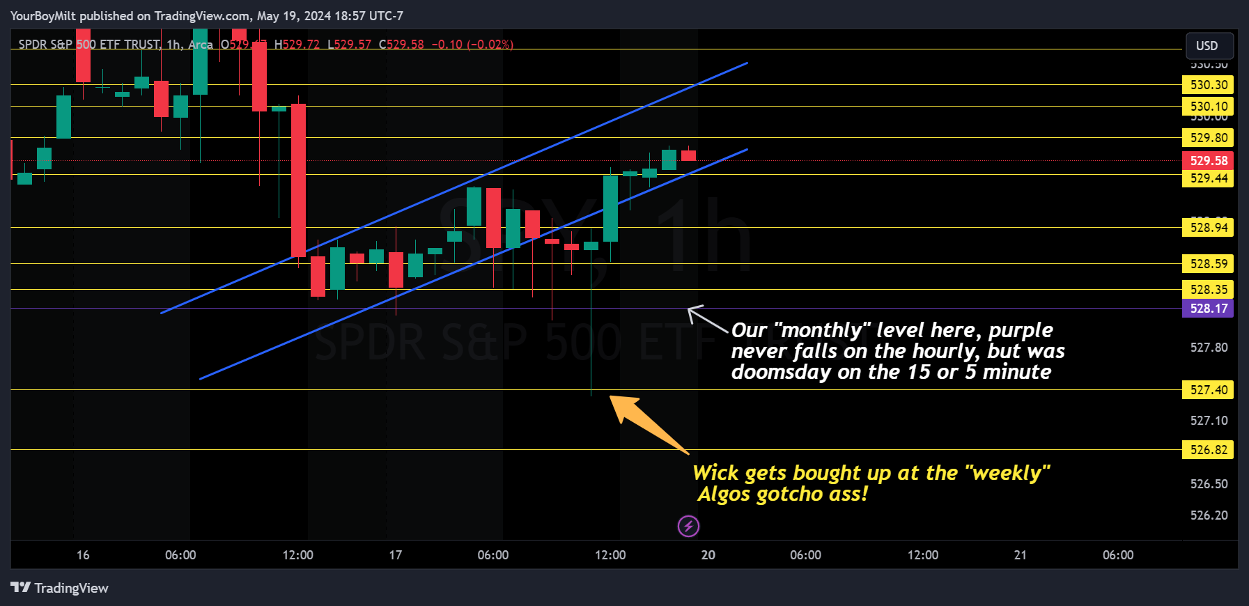 A great example of that illusion was this Friday on a dip during trading that I swore on YEET Plus twitter account was getting bought up. Imagine the purple level as a monthly (it’s major), and the level it gets bought at as a weekly—they gave us a hint that they’re playing those games again.