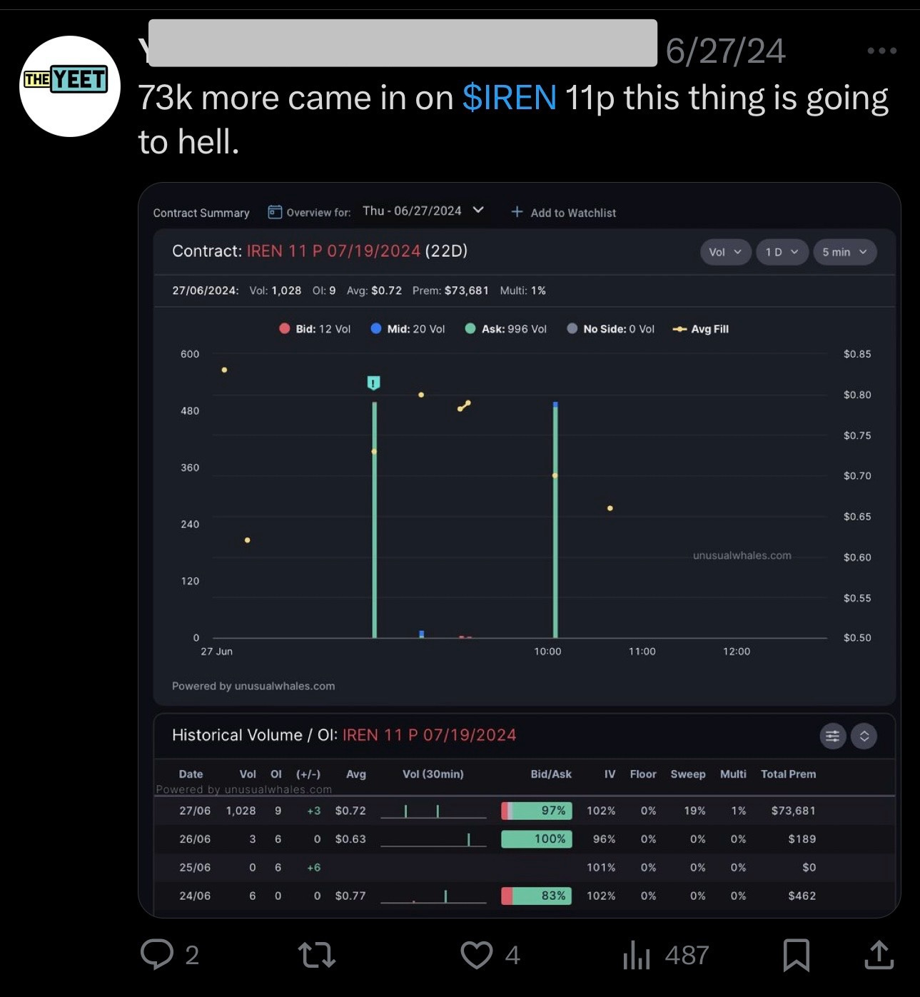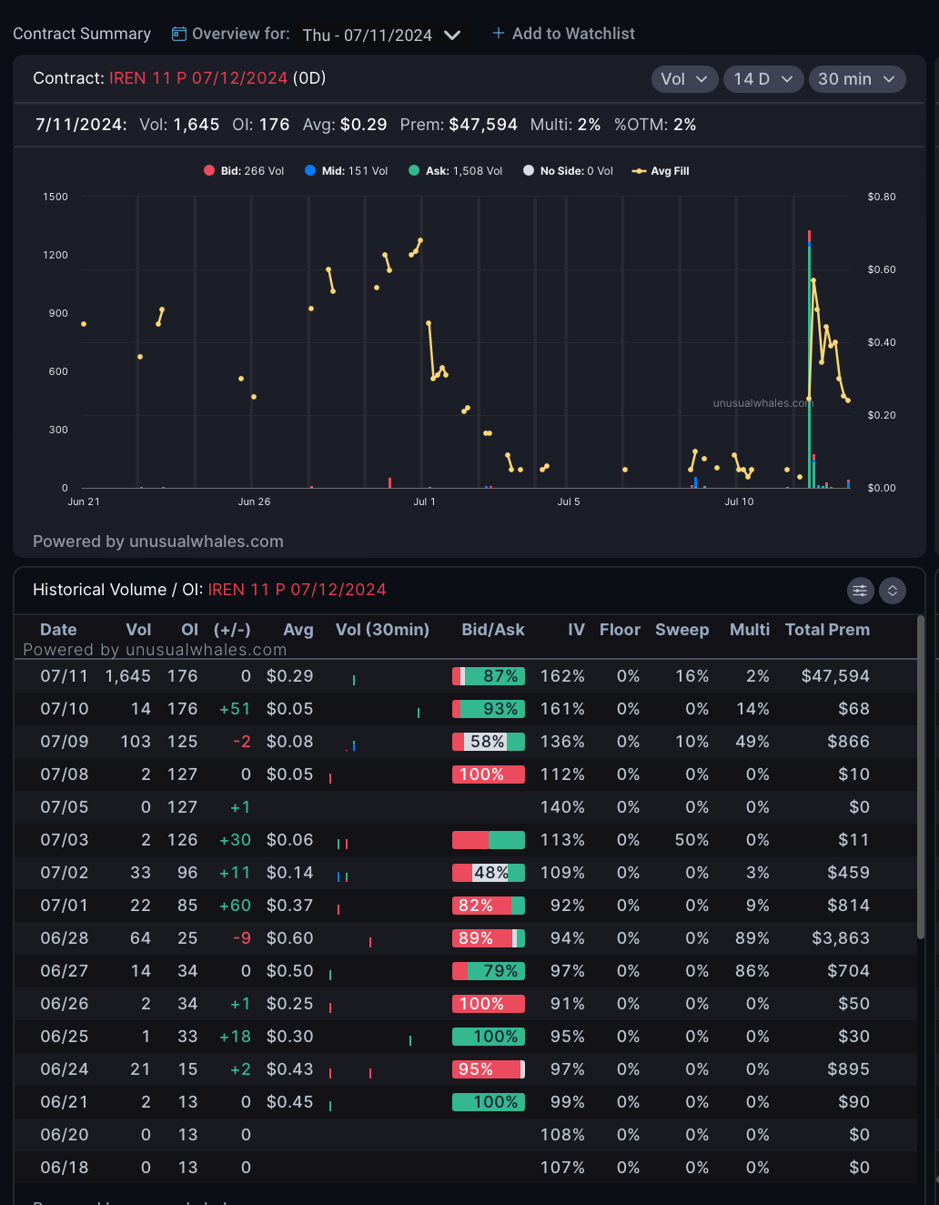 And there you have a young degenerate rolling into IREN 0.00%↑ with about 3 days until expiration. Quick research would show that this is not a stock that sees a lot of options activity—nor does it have a huge market cap—so you should be thinking “hm. That is a weird…weird hedge.” What was this degenerate chasing….?