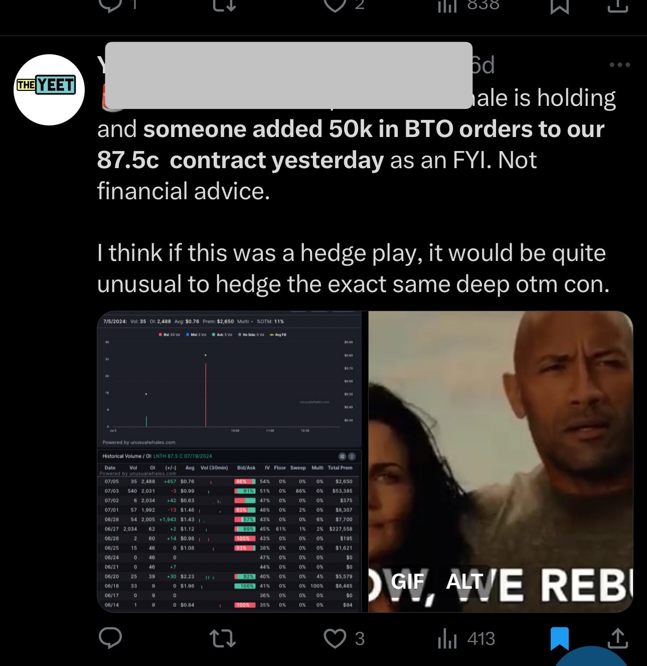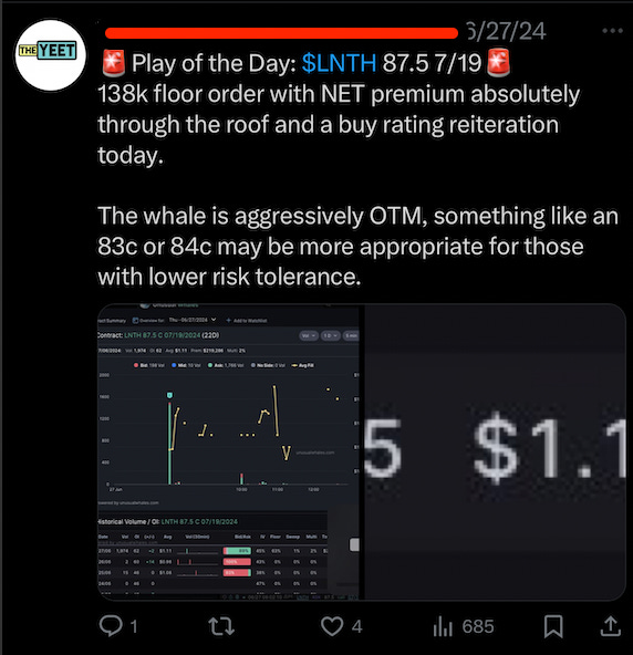 Yesterday we hit on $LNTH—our alerted entry and exit at YEET Plus was for 1,500% and contracts are currently at 3,200%