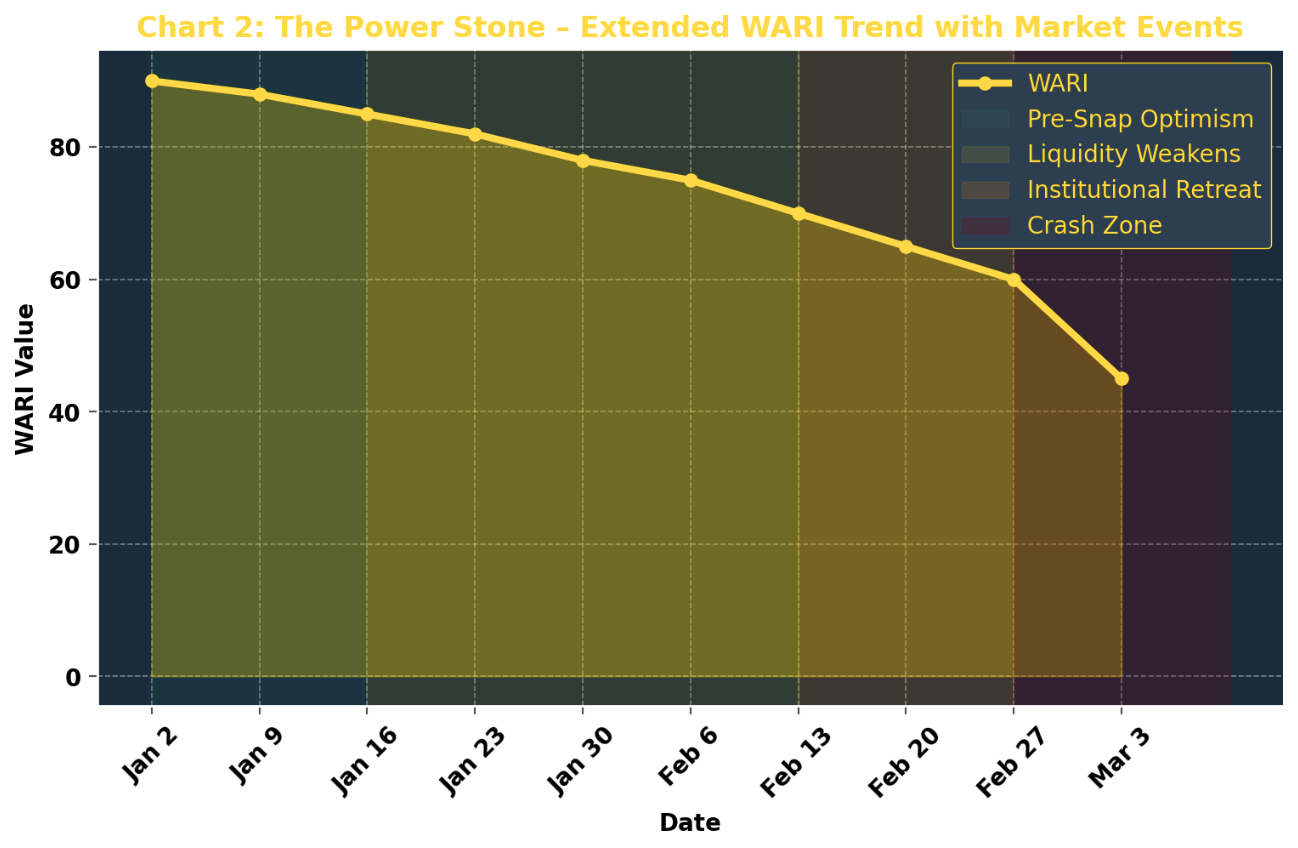 WARI tracks institutional liquidity and positioning by analyzing large orders, bid-ask spreads, and dark pool flows.A declining WARI suggests institutions are pulling liquidity, leaving markets vulnerable to erratic moves. When WARI approaches extreme lows, liquidity vanishes, and volatility spikes.