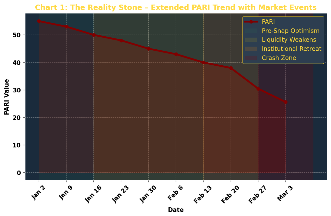 PARI measures market fragility by analyzing momentum, volatility, and trend persistence. A falling PARI signals increasing risk of sharp moves, often preceding market instability. When PARI drops below 30, volatility surges, and sell-offs become more likely.