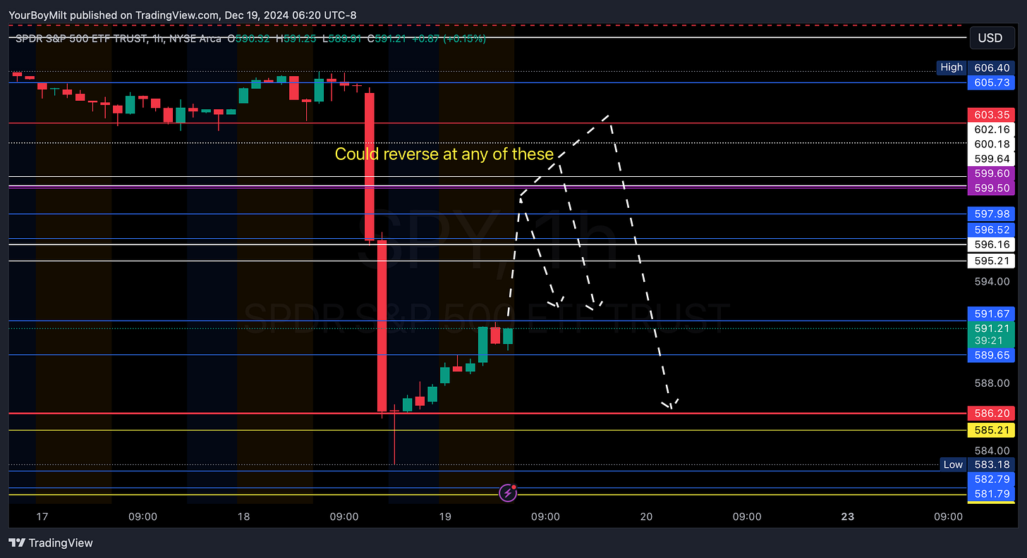 Hard Close: 595.21â thats the first weekly level and key resistance likely. Today and tomorrow weâre in the business of winning tradesâno holding for style points.