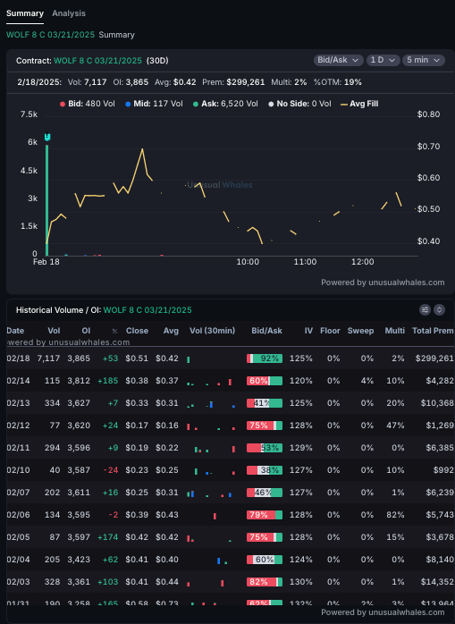 This setup on WOLF was a textbook reclaim of prior resistance turning into support, making it a perfect spot for calls. Here’s how we pulled it off starting with finding this flow on The YEET Plus Filter The Freelance Five—note the volume to OI.