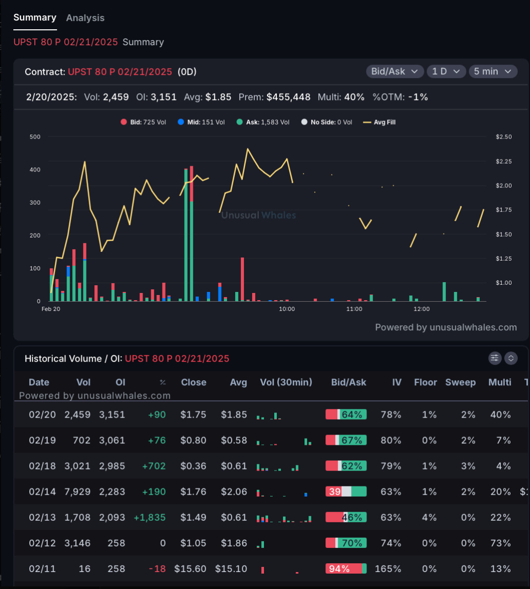 First up, we’ve got a same-day expiration (0DTE) idea that showed some serious volume. The UPST 80p 2/21 had 2,459 contracts traded on expiration day, with $455K in premium behind it. Open interest was stacked at 3,151, meaning plenty of traders were holding on, and the volume tells us a whale was active.