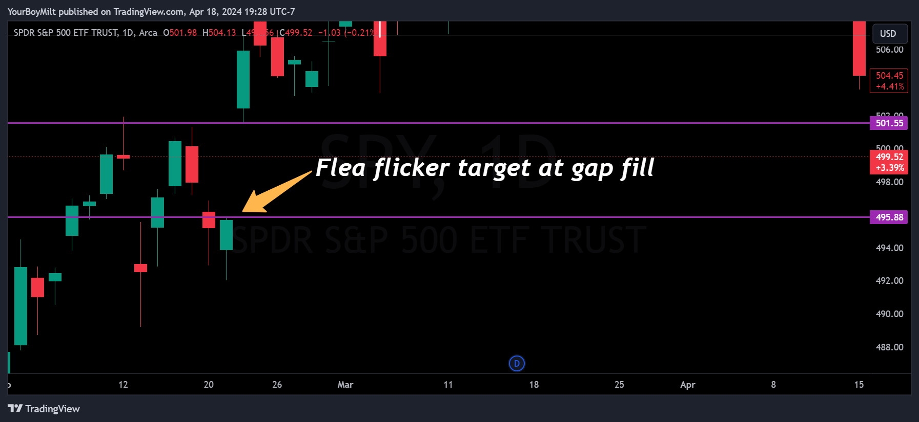 When we switched to tracking hourly gaps, I forgot to check the daily additionally which is my normal primary check. Lo and behold, a giant gap to 495.82 whichāaccording to our own thesis on the Flea Flickerāwould have been the true target on the SPY train. Sorry for the error.