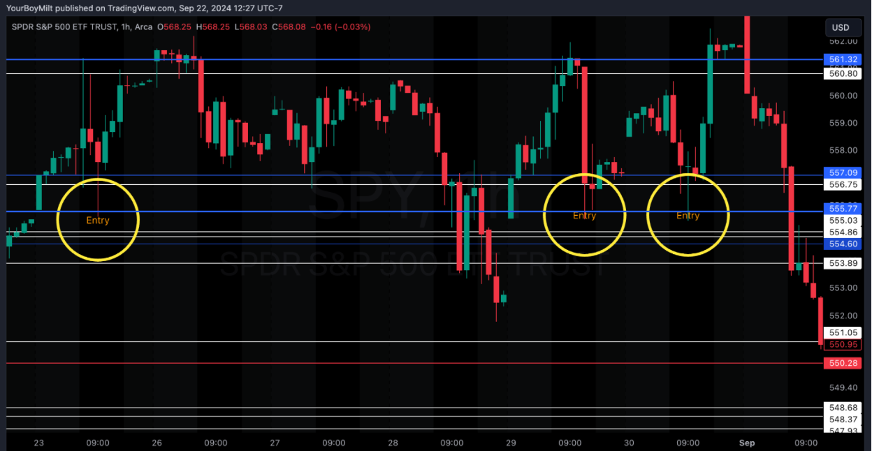 When candle bodies went past the line, they tested the next level. But when they wicked off or flattened at the gap entry, it was a reversal signal. So on 3 quick day trades we applied that same move—three times in a row: