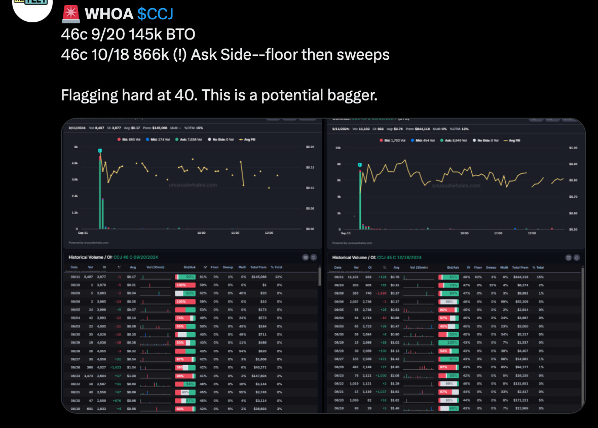 CCJ did the same thing: a whale entered the 46c weekly and the 45c monthly the same day: