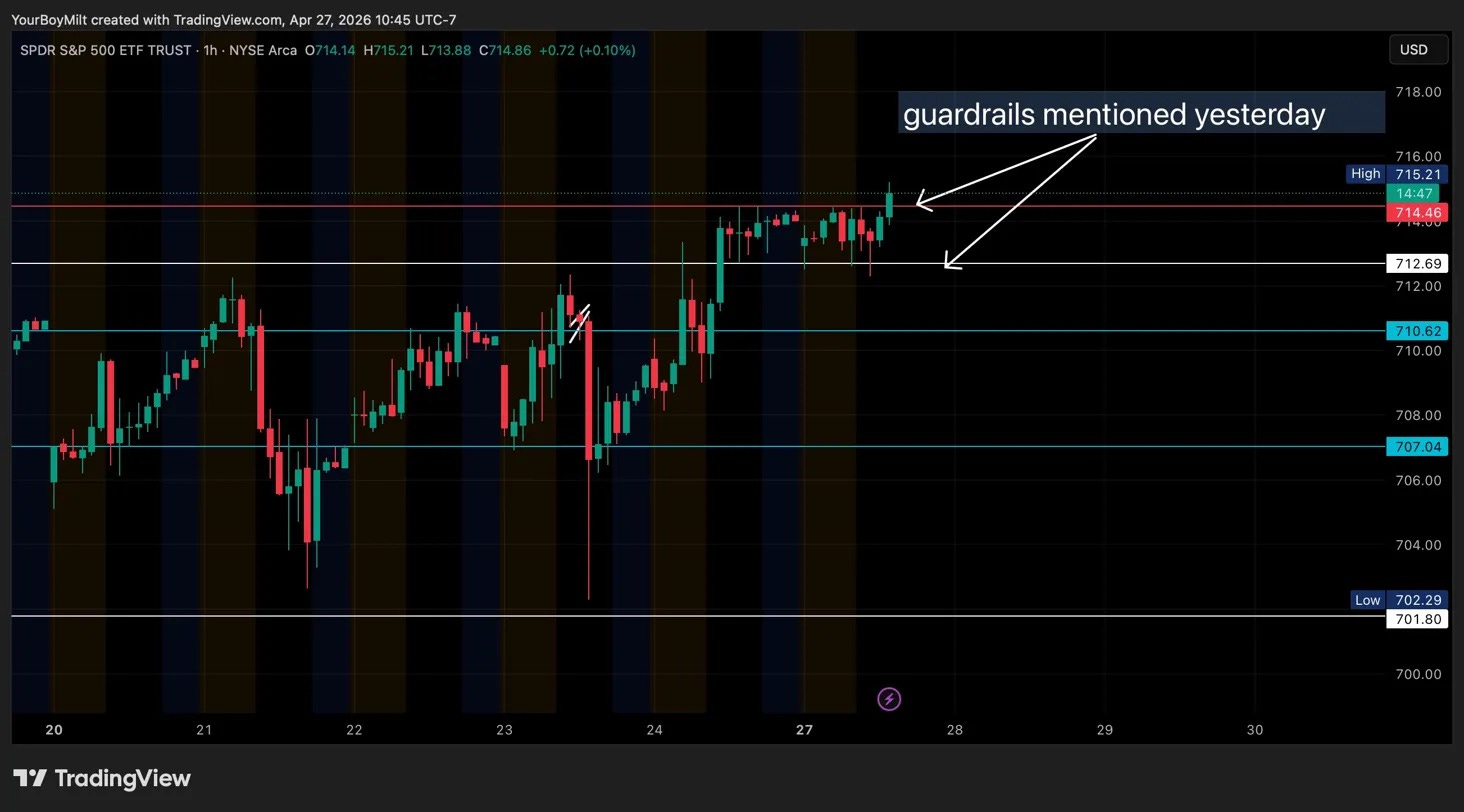 Yesterday we gave you two numbers: 714.46 on top, 712.69 on the bottom. That was the whole tape from April 24 through this morning. Up to 714.46, rejected. Back to 712.69, bounced. Up to 714.46, rejected again. Over and over. Same ceiling, same floor, different candles, same result.