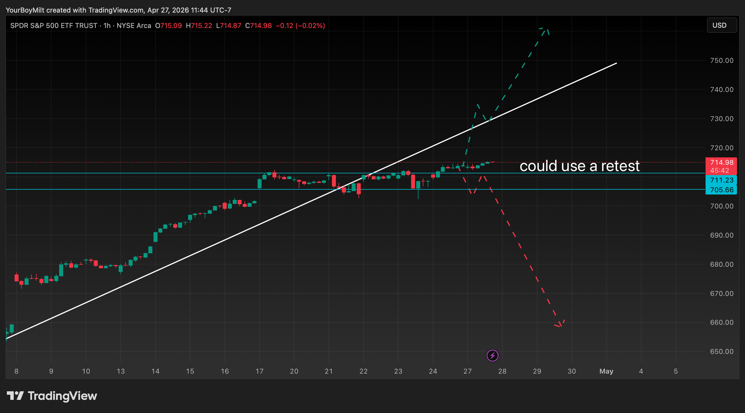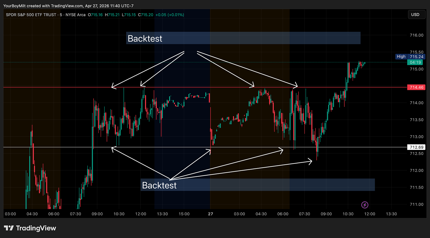 Now we wait for the retest. That’s when 714.46 needs to flip from resistance to support; price comes back down, touches it from above, holds it. That’s the confirmation. Without it the break is just a wick above a line and those don’t count.