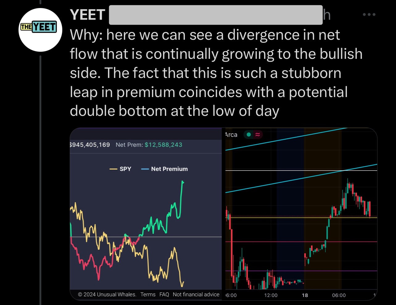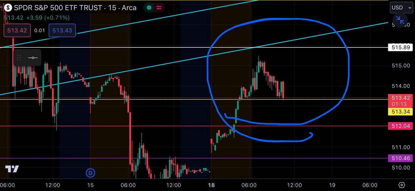 In this trade we used chart confirmation of a bottom/double bottom in tandem with growing net premium sentiment. SPY hadn’t been able to stay under our 513.3 level all day and once we saw it hit that low again with bullish premium increasing, it seemed likely we’d get a bounce at that level.