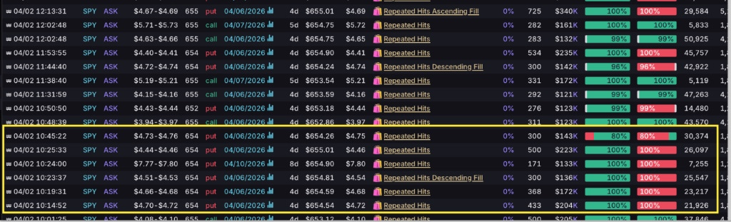 Then we see a Put STACK emerge between 10:14 and 10:45. Whales hammered the 654 puts repeatedly.