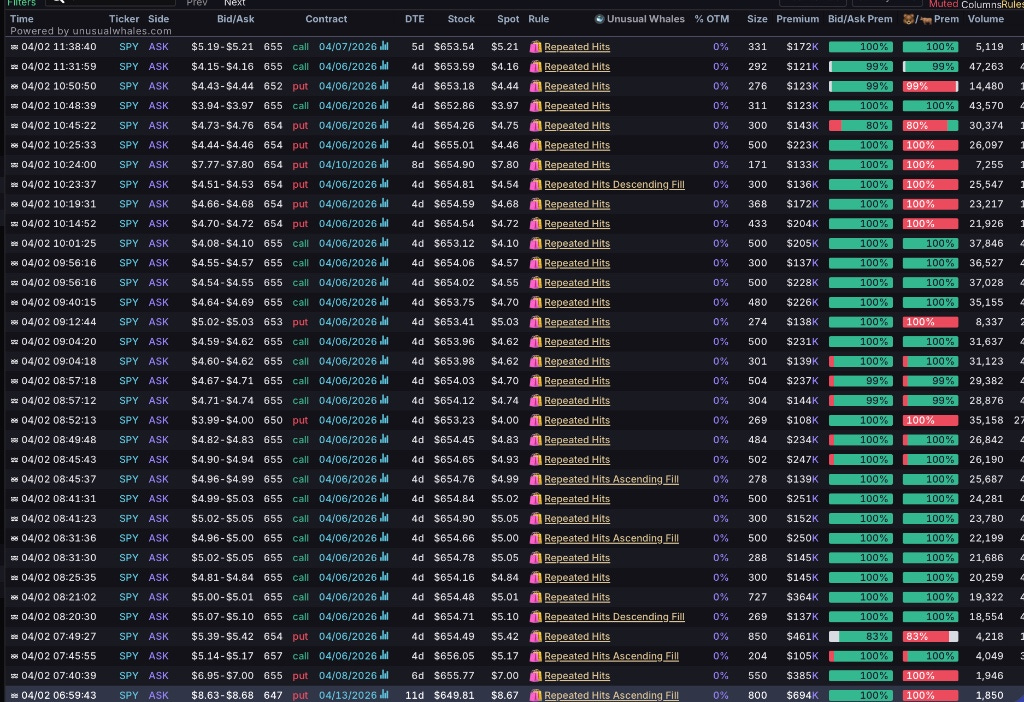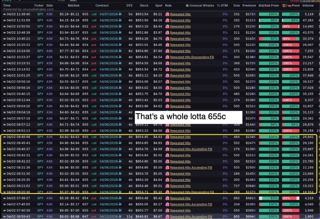 We see the Call STACK (specifically the 655c) before and into the morning bounce upward. As SPY was falling and catching its footing, whales were layering in: