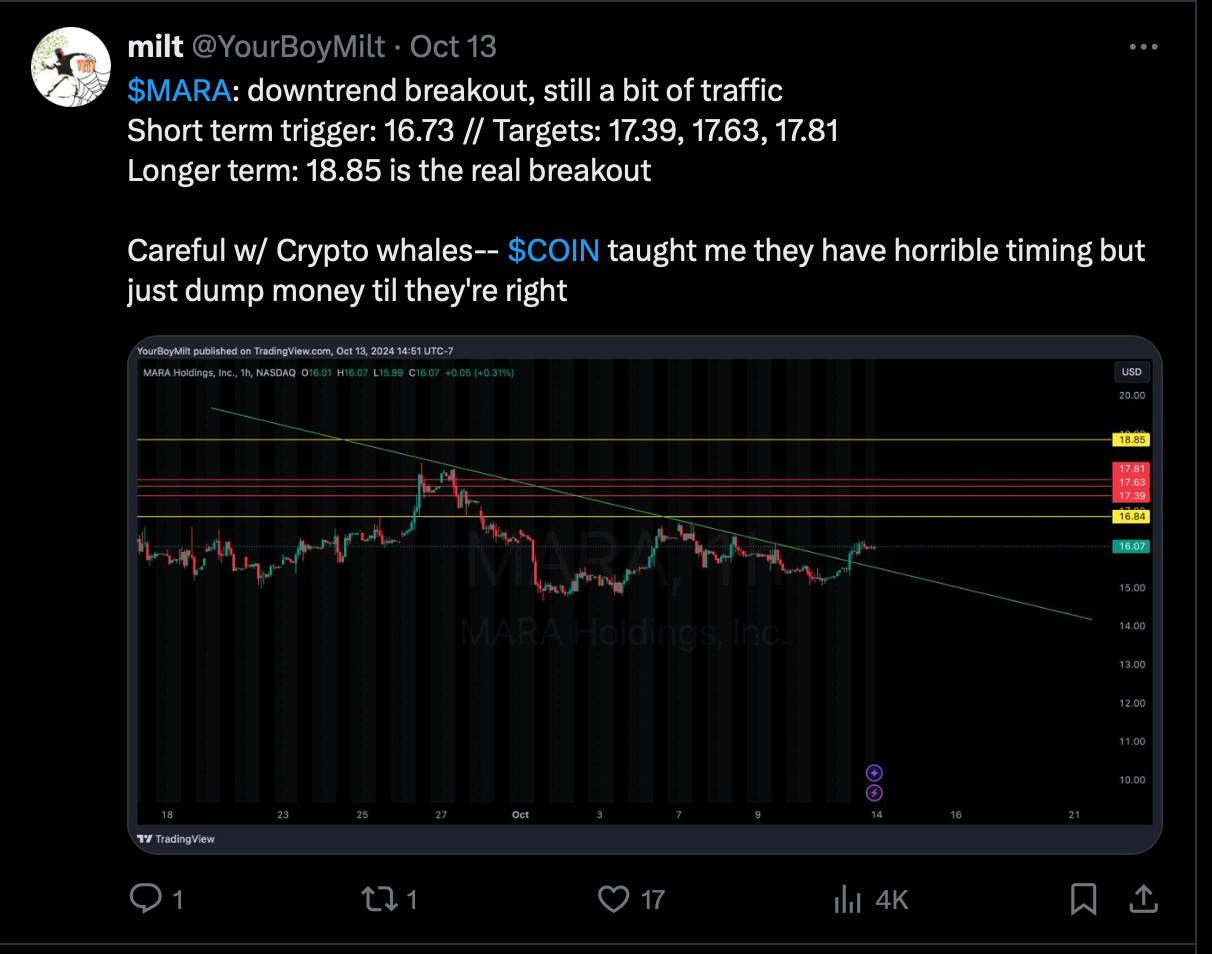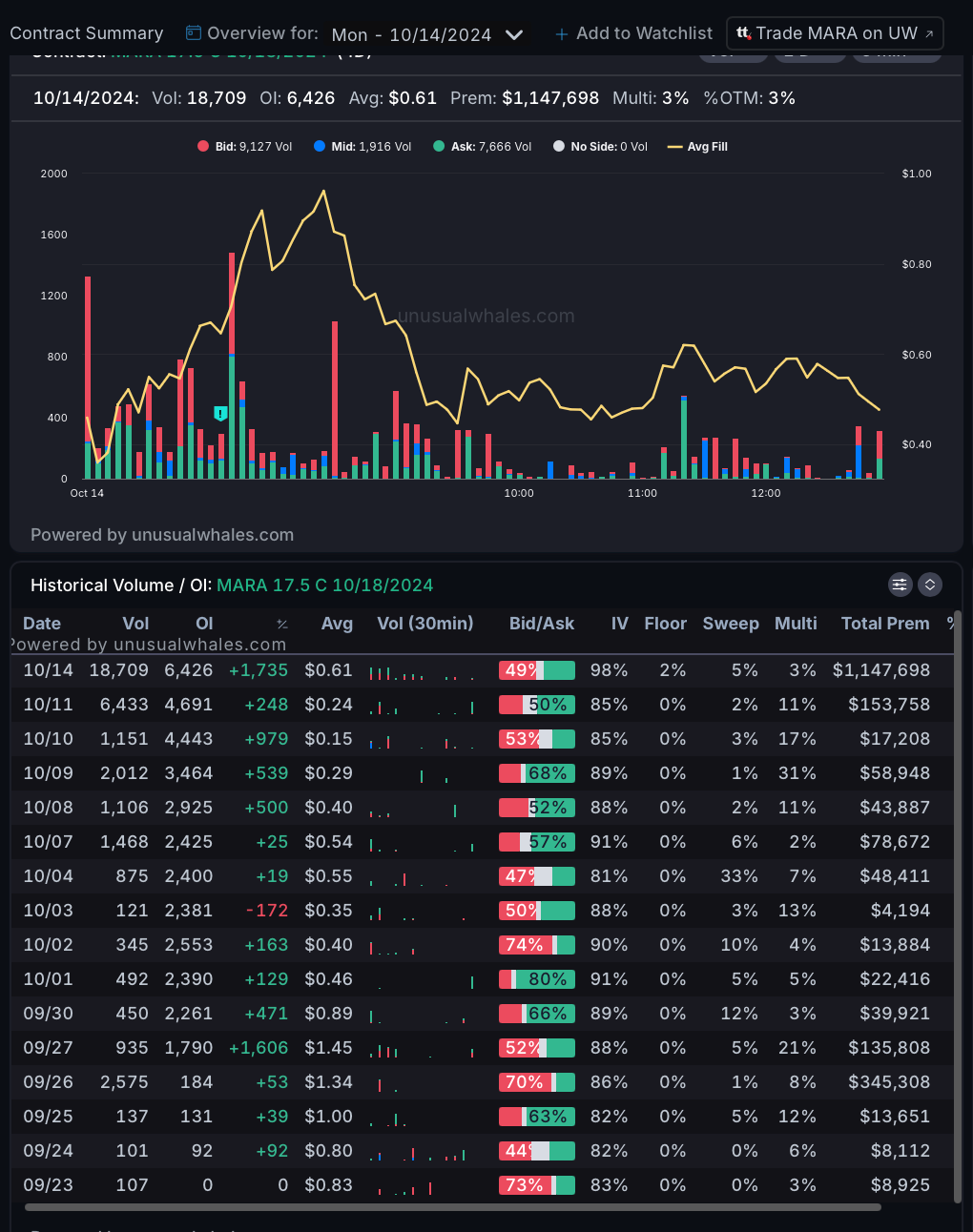 Shout to hempsteadtires for putting the chatter on our radar. When looking for MARA flow what immediately stood out was the 17.5c 10/18 activity from Friday