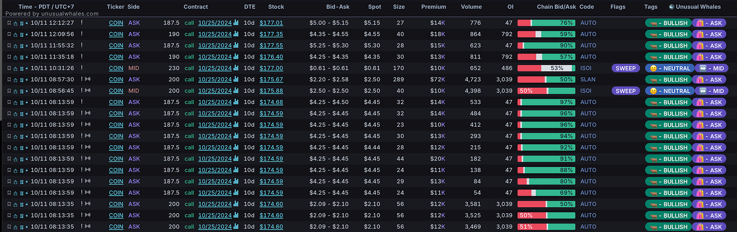 A search of the flow Friday also revealed a high amount of activity on the COIN 187.5c and 200c 10/25—both contracts deep outside the money with a close expiration