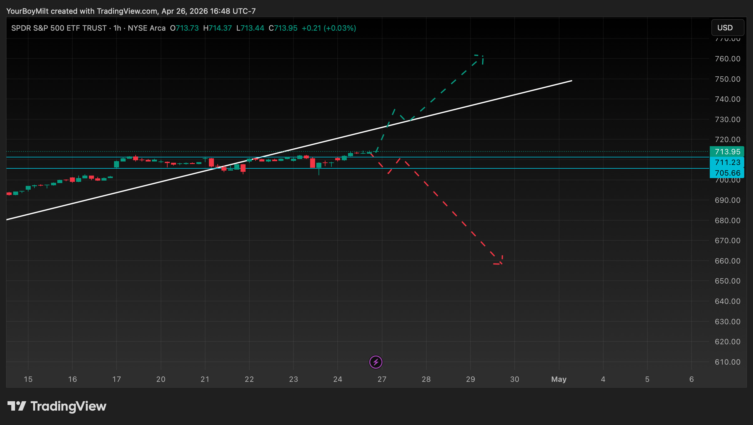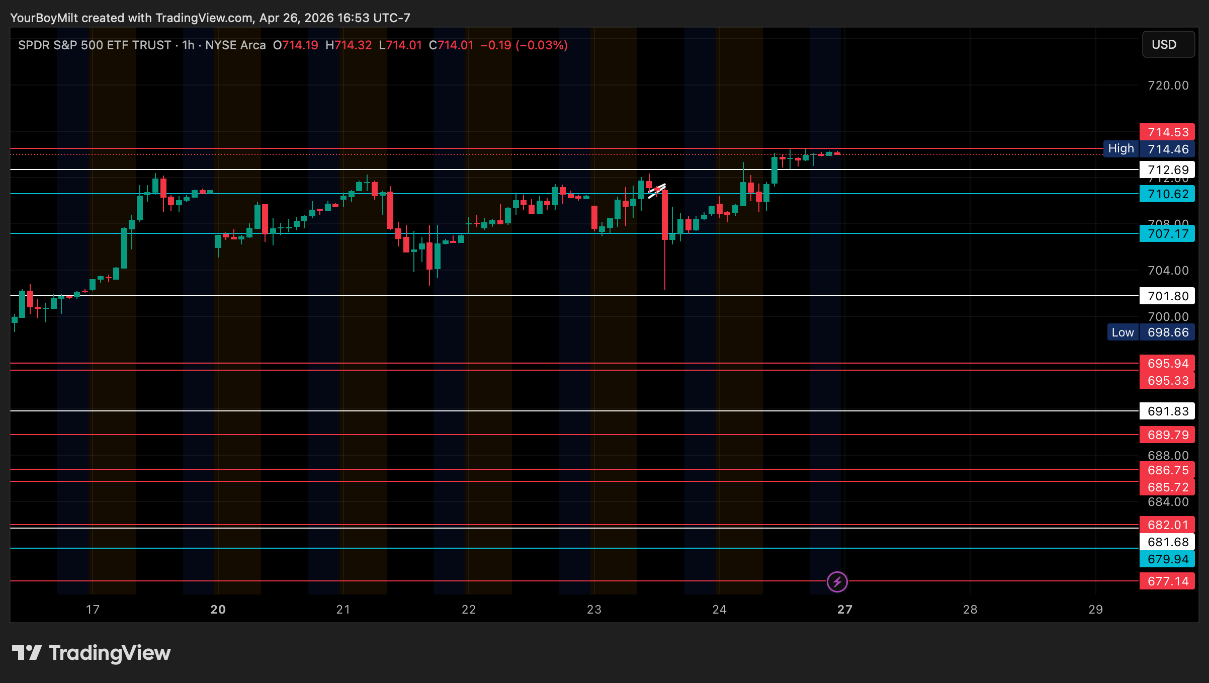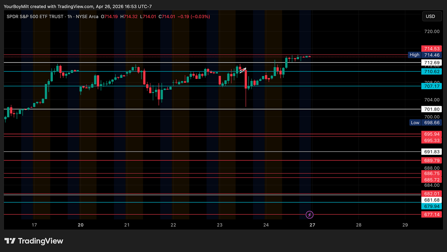 SPY closed the week at 714.01, pinned just under the weekly high of 714.53 like a man who ran up four flights of stairs and is now catching his breath at the door. The chart is honest: we ripped from 670 on the 14th to 714 by the 17th, chopped sideways for a week while the market decided whether it believed itself, got spooked into a Thursday wick all the way down to 707, and then reclaimed Friday like nothing happened. That wick matters. It was the market checking whether anyone was actually holding, and the answer, apparently, was yes. SPY wants 720. Until 714.53 breaks and holds, this is a ceiling not a launchpad, and a ceiling kissed twice has feelings about the third visit.