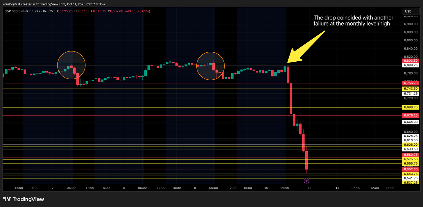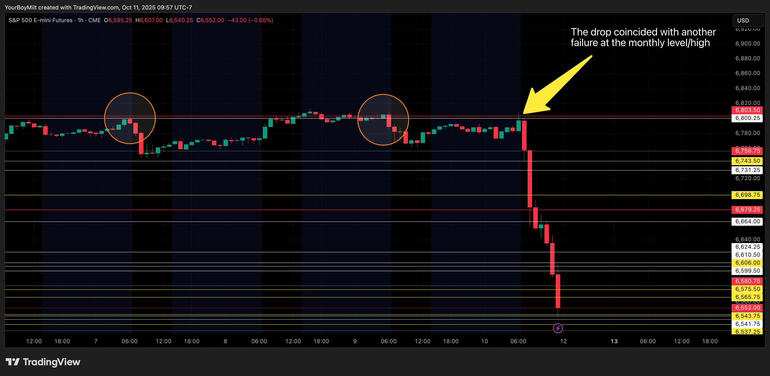 The drop we saw yesterday didnât come out of nowhere â it lined up perfectly with a third rejection at the monthly high, the same zone thatâs been tagged and sold each time weâve gotten close.