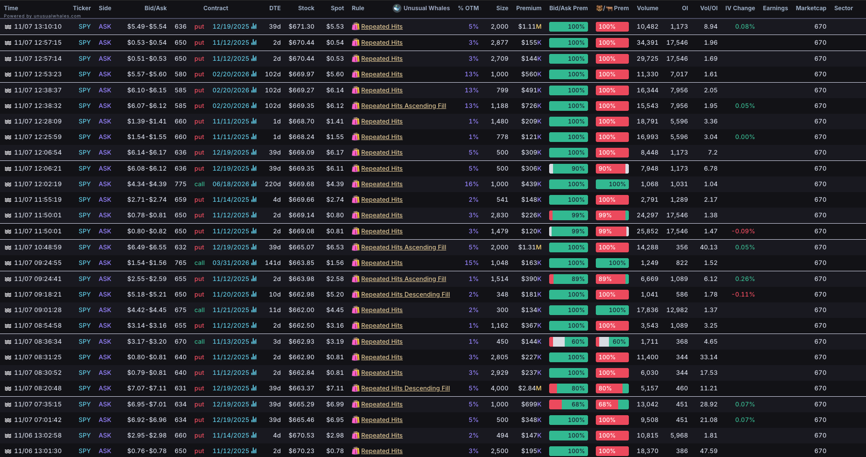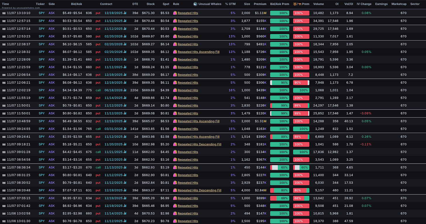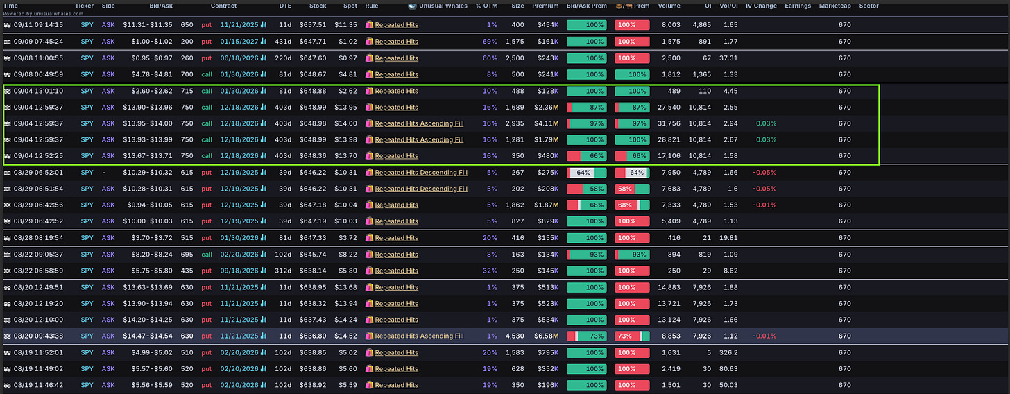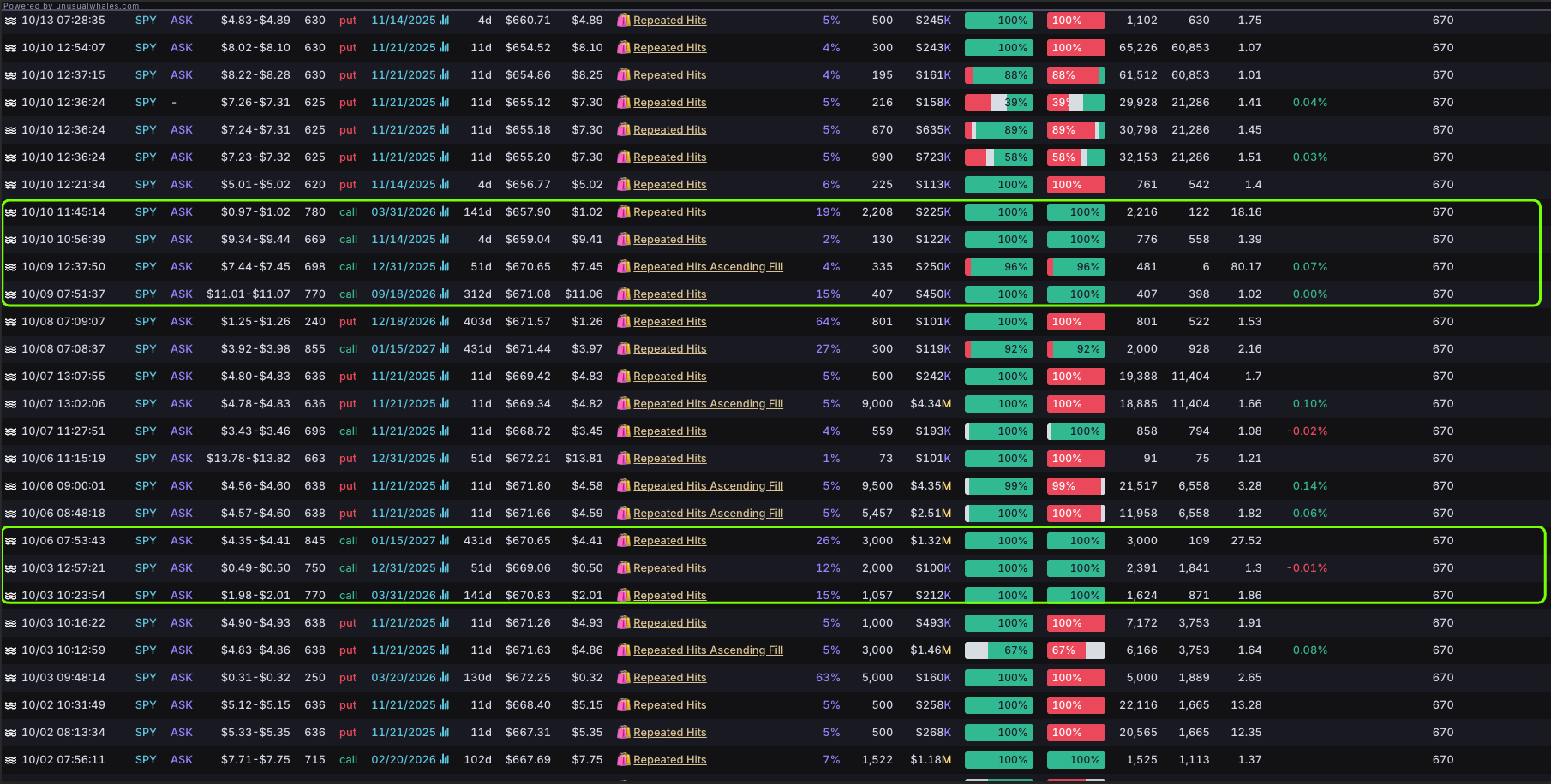 This doesn’t happen in isolation. Look back through the whale tape from summer through early fall — every major run-up in SPY was preceded by clusters of large bullish call buys.