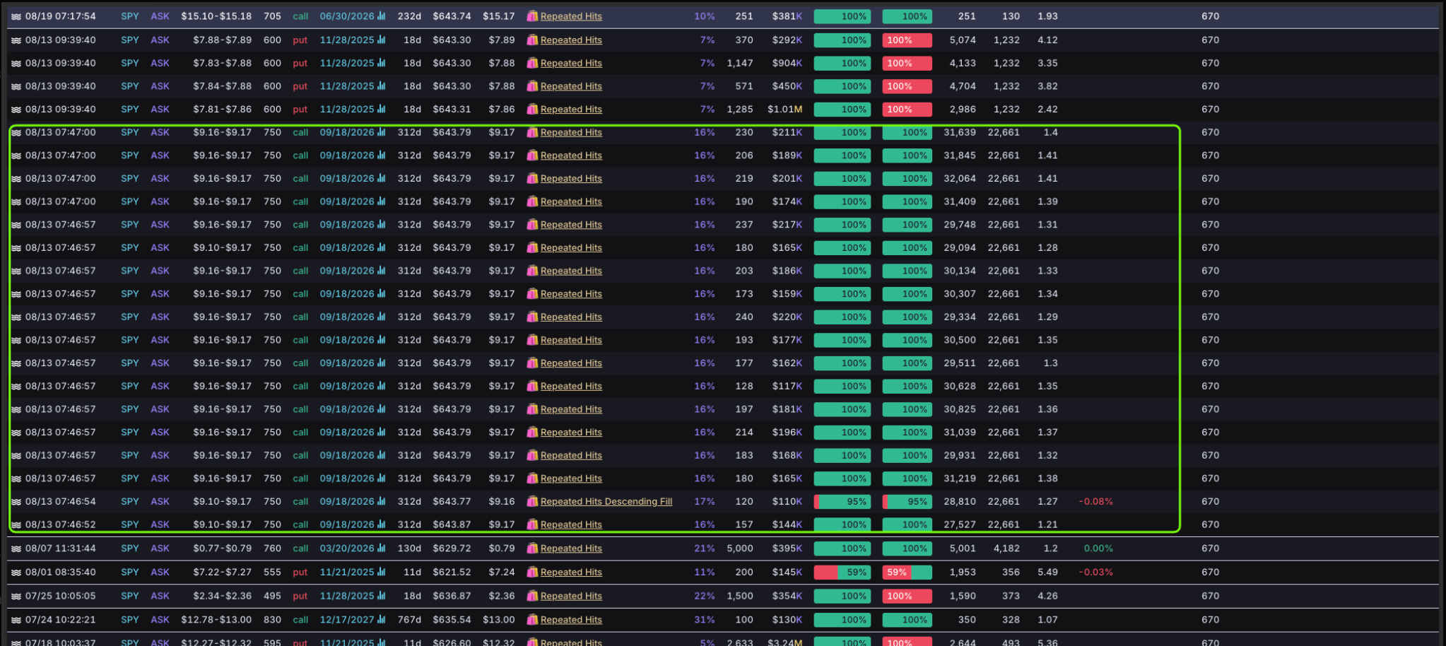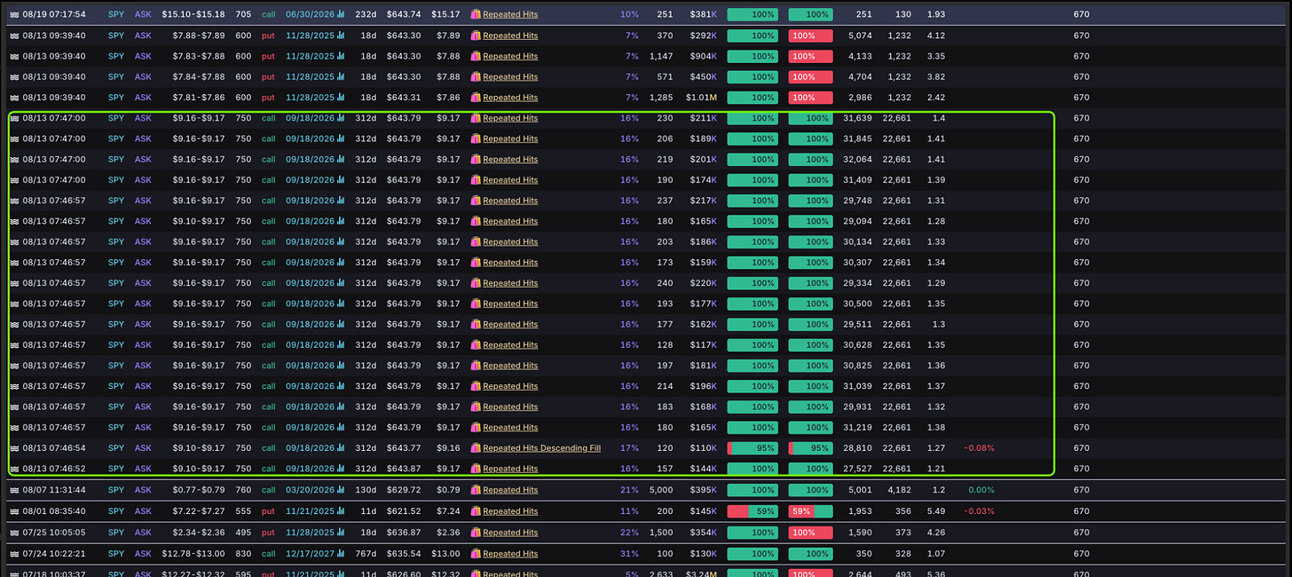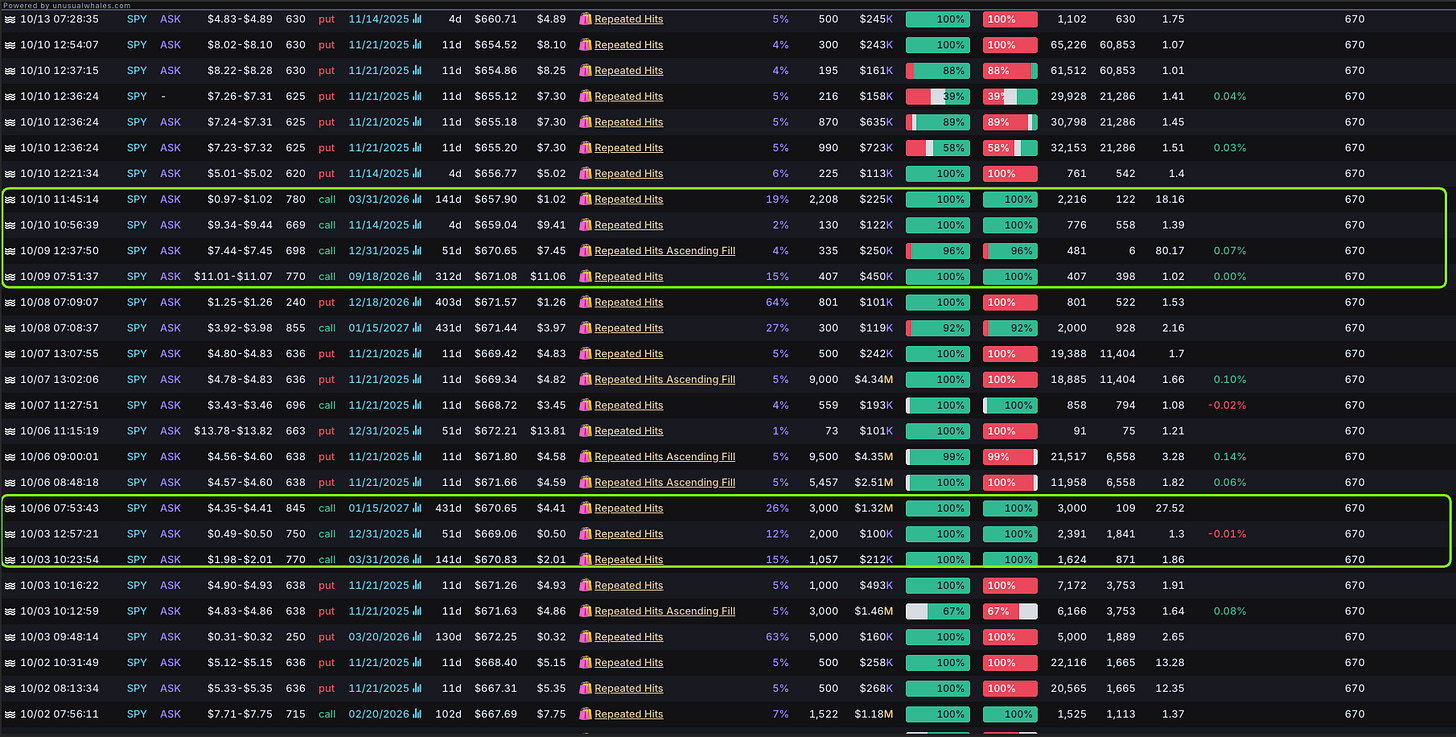📈 June through September: repeated SPY 700–750 calls and others stacked across months, big sporadic blocks that preceded or coincided with SPY price runs: