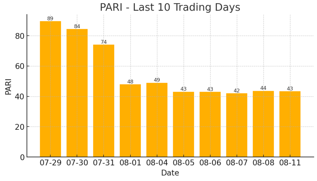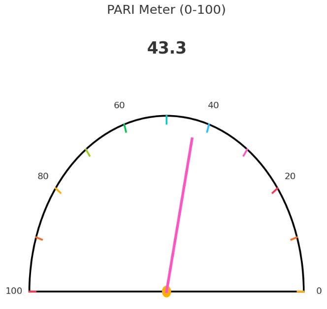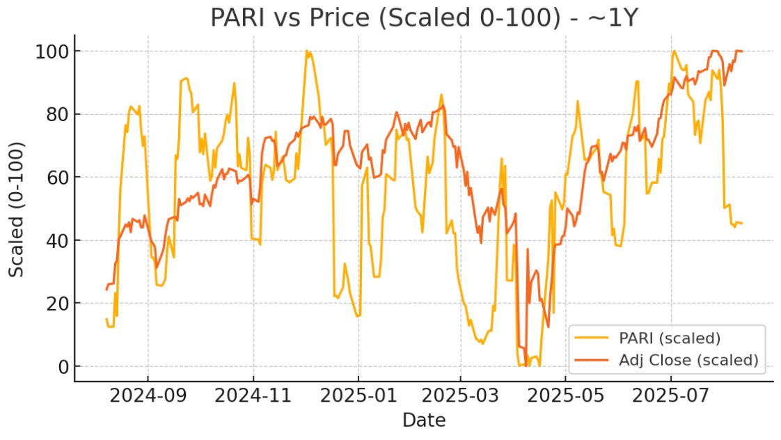 Risk flips: 🚨 A jump in realized vol OR fresh momentum break down sends PARI into the 30s → defensive posture.