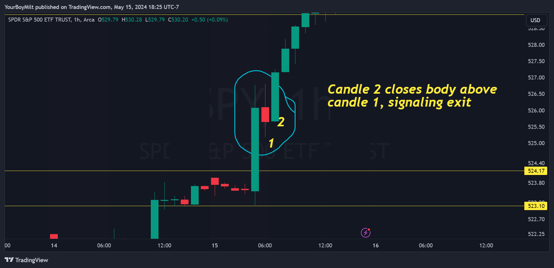 3. When in doubt on a trade, switch to the 10 minute for scalps, the 340 minute for directional trades, and the 1 hour for swings. When the next candle BODY on that time frame closes beneath the previous candle, that’s your exit.