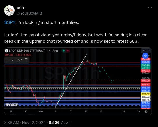 SPY is bearish. Not because I'm a new bear from Friday--but for the reason I said this would happen Wednesday--we're rounding off as trends are breaking.