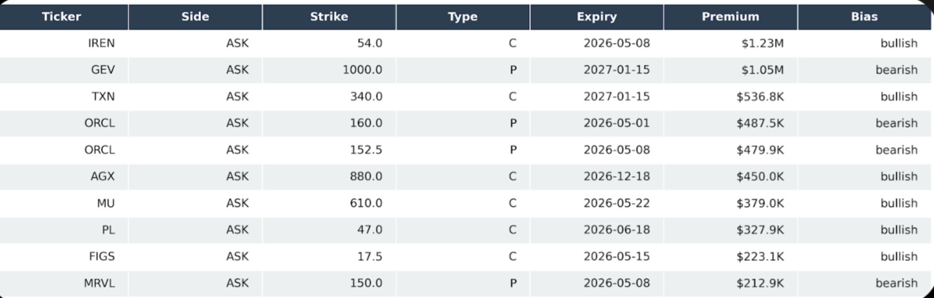 CRWV 98p 5/1– High volume of short-dated put sweeps.