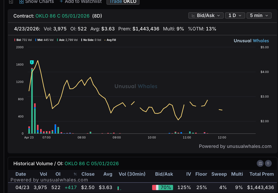 OKLO 86c 5/1– Aggressive near-term high-strike buying