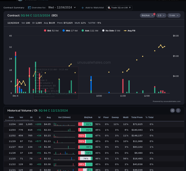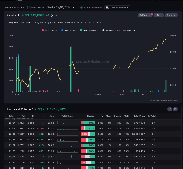 On 11/27 there was an alert for SQ 93c expiring 12/6—more than 5% otm, two weeks to expiration