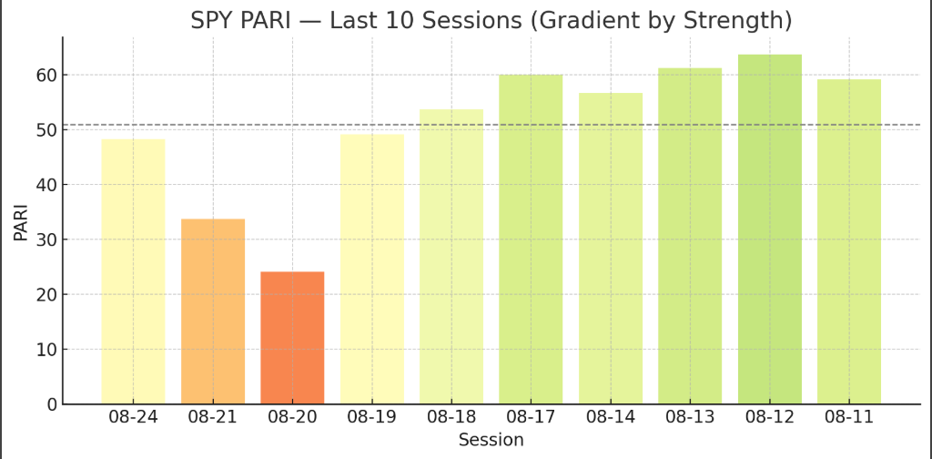 Bars show the last 10 PARI prints. Average is ~62. We’re sliding lower from recent highs, which often means momentum is tiring.