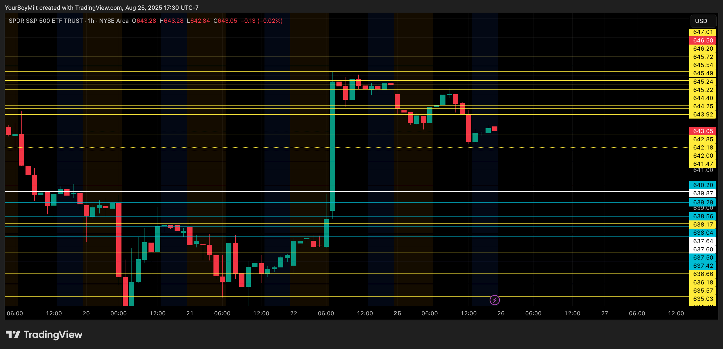 Read: We’re boxed 642.85 ↔ 646.20 with 646.50–647.01 (🔴) the real lid and 640.20/639.29 (🔵) the trapdoor if bids thin. This is a coil at the ceiling.