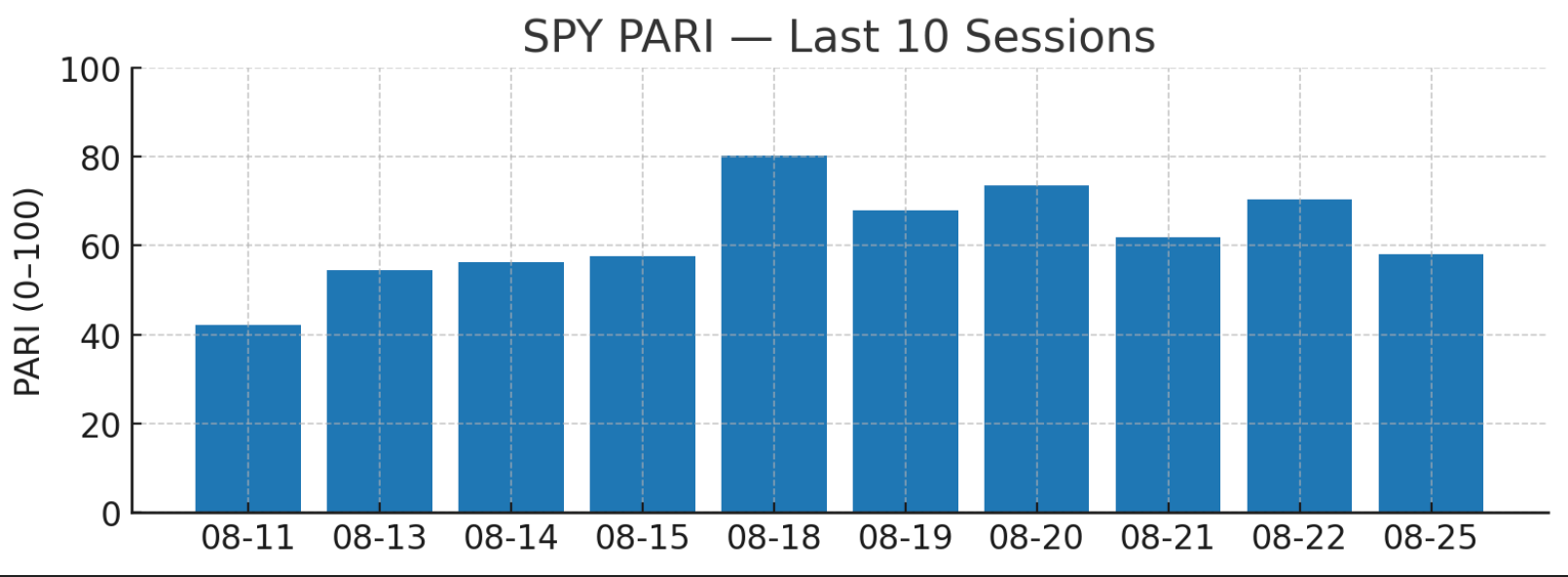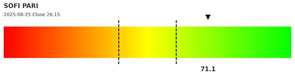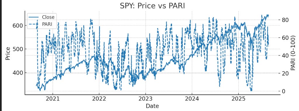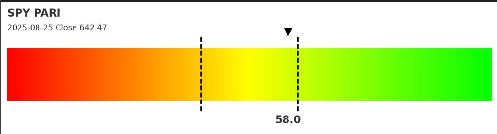 Price is near highs, while PARI cooled—that’s classic carry-up / quality-down divergence. When that resolves, you either get fresh momentum (PARI reclaims >60) or a hang + chop toward mid-range (40–55 zone).