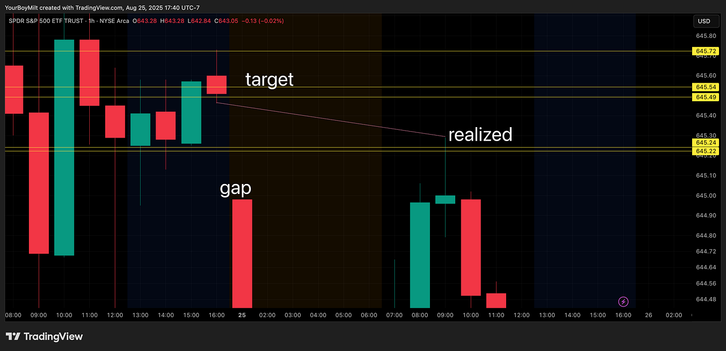 Today in the room we took 635c SPY calls for the gap fill—seemed like an easy enough play. A reminder though that even when the gap fill is on, Price Action has the right to reject at any resistance level. Here, you can see we turned around at a homemade resistance level just 20 cents shy of the target.