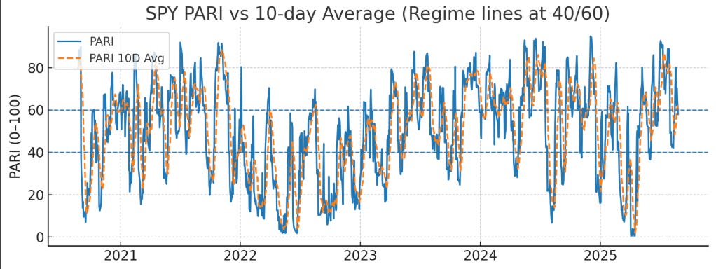 RULES flagged BUY on the regime: PARI printed above 60 (green zone). That’s the threshold-based signal—independent of slope.